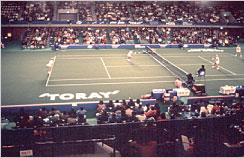 A game played with rackets by two or four players who hit a ball back and forth over a net that divides the court