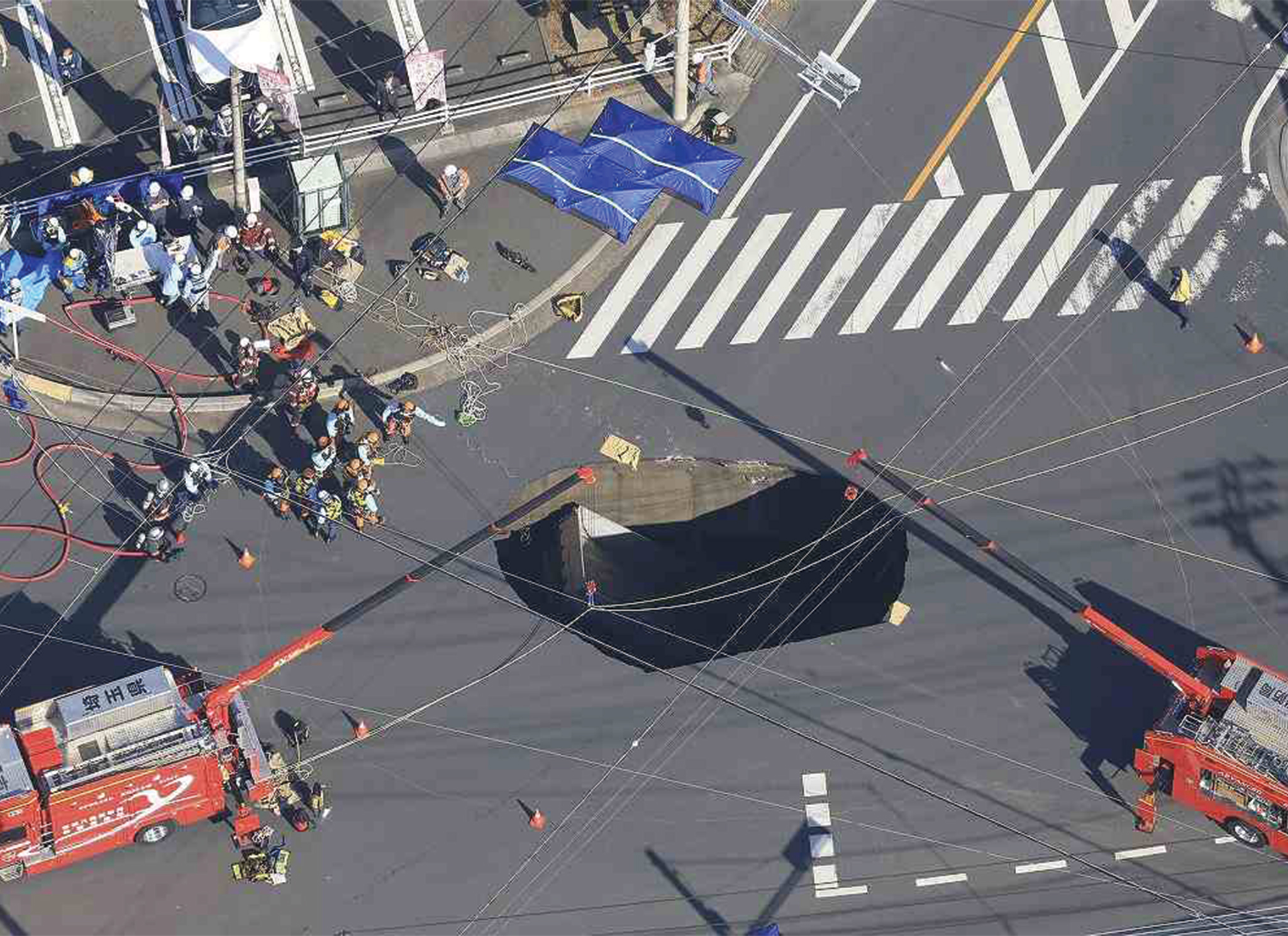 Rescue workers are still trying to retrieve a 74-year-old truck driver whose 2-ton vehicle fell into a large sinkhole at an intersection in Yashio, Saitama Prefecture, on Tuesday morning. A report of the collapsed road and the fallen truck was received at around 9:50 a.m. According to firefighters, the hole is about 10 meters wide and 5 meters deep. The collapse, local authorities have said, was likely caused by a ruptured sewage pipe running around 10 meters below the prefectural road.