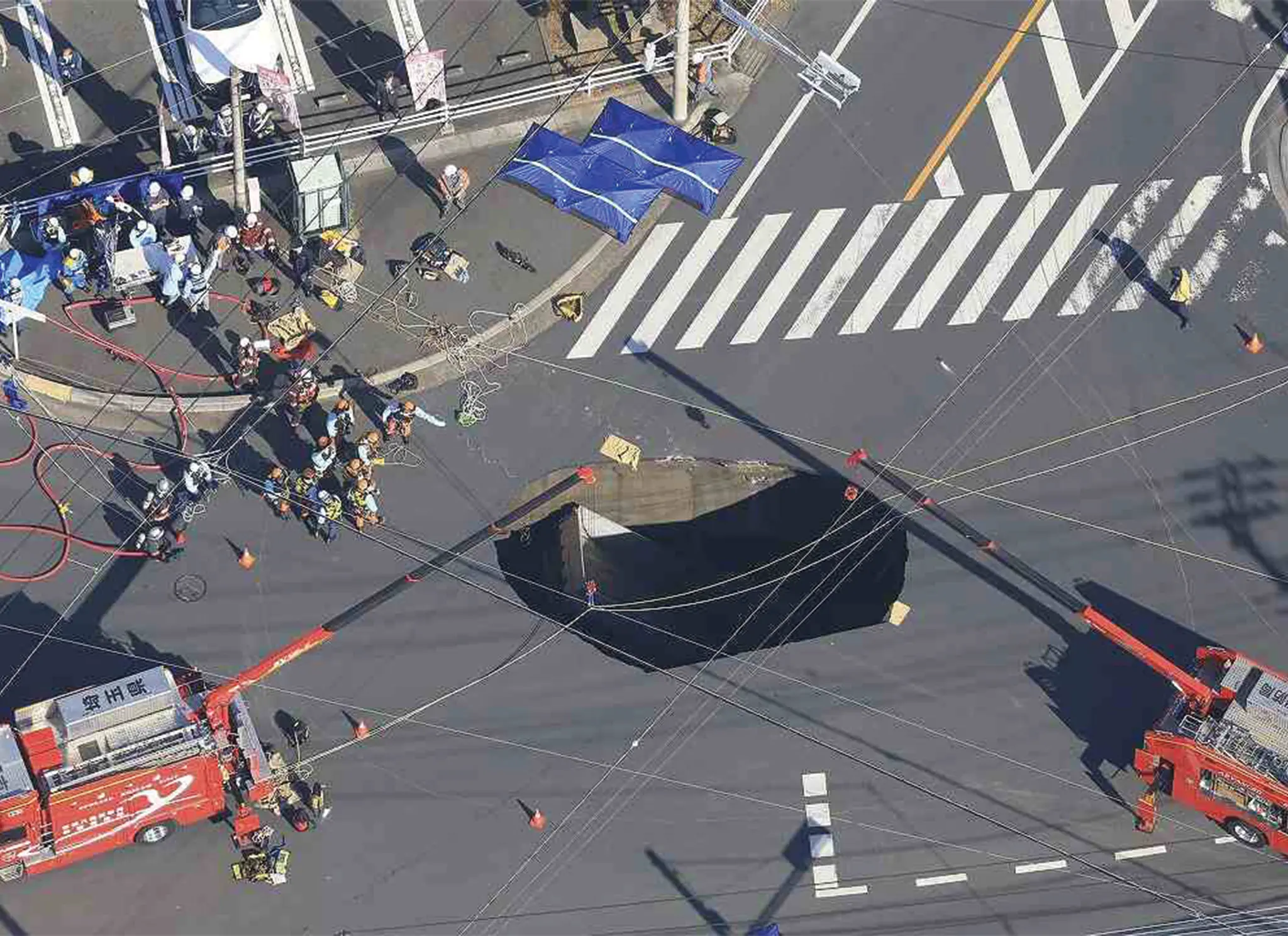 That same morning, a new sinkhole emerged nearby to further hamper the rescue operation. NHK reported that it began to widen in the early hours of Thursday. Residents within a radius of about 200 meters from the sinkholes have been urged by Yashio city officials to evacuate, as further cave-ins could damage the underground gas pipes and potentially cause a gas leak. On Wednesday night, workers began pumping up sewage water to discharge it into a nearby river as an emergency measure.