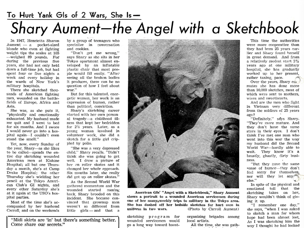 USO public relations employee Shary Aument discovered that her childhood hobby of sketching portraits could bring cheer to injured soldiers. Supported by Eleanor Roosevelt, Aument traveled across America during World War II organizing brigades of artists to sketch bedridden wounded veterans, eventually publishing a book of sketches featured in the magazine Harper’s. During the Vietnam War, America’s wounded soldiers were sent to Japan, and so Aument moved to Tokyo, spending her days sketching wounded American men at Kishine Hospital, Camp Drake Hospital and other venues.