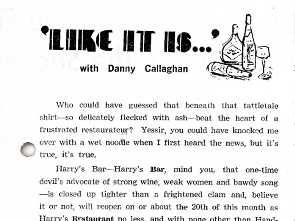 Columnist Danny Callaghan clues readers into Tokyo’s food scene, noting that Harry’s Bar in Roppongi is reopening as Harry’s Restaurant, now offering Chinese and Mexican specialties. Writes Callaghan, “Roppongi needs another Chinese restaurant like Golda Meir needs Nasser, but if by some fluke Harry actually could come up with some passable Mexican food, he might very well have a winner. There just ain’t a decent bowl of chili and beans in town.”