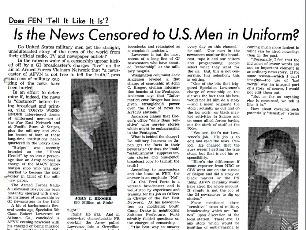 Tokyo Weekender interviewed dozens of uniformed men involved in military media to determine whether news being reported from Vietnam was being “doctored” prior to broadcast and print. In light of a live broadcast delivered by Georgia-based newscaster Specialist 5th Class Robert Lawrence claiming charges of news suppression, Tokyo Weekender reached out to Tokyo-based broadcasters to see if they had a similar opinion to Lawrence, all of whom “answered with an emphatic ‘No!’”