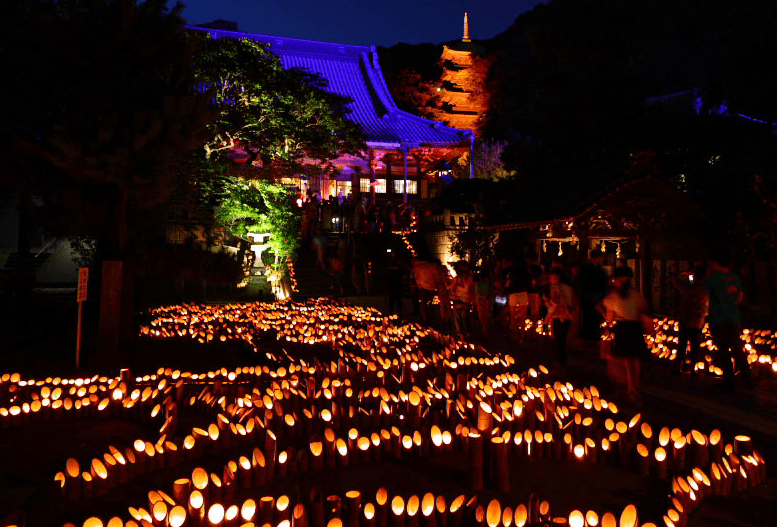 This spectacular illumination event takes place at historical Ryukoji Temple in Katase (near Enoshima) and uses 5,000 bamboo lanterns to light up the whole temple grounds. The flickering lights create a mystical atmosphere around the temple, while colored lights illuminate the temple itself.