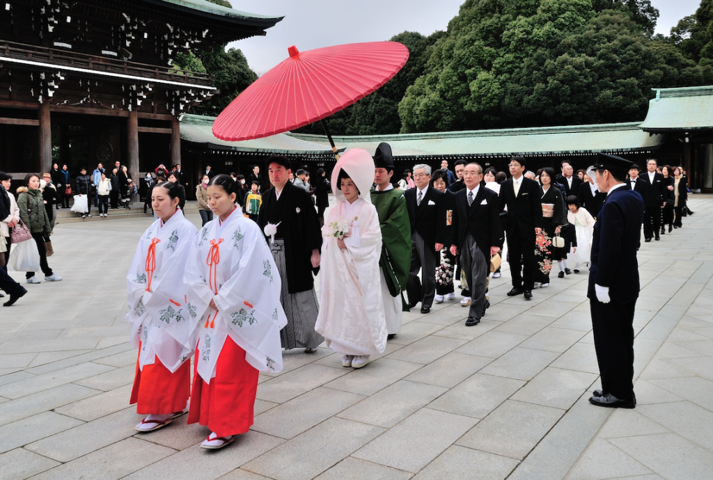 Unless you want to replicate a Western wedding at a chapel (or cathedral at St. Mary’s in Chiyoda), there won’t be any vows or “I dos.” One sixth of all weddings today in Japan still follow traditional Shinto or Buddhist customs. They are considerably smaller than Western weddings as couples only invite immediate family and a best friend to witness the ceremony. During the ritual, all parties will kneel in the main hall of the temple, and a priest will give their version of a sermon. Then, the bride and groom take three sips of sake to receive blessings from the kami (gods), and leave symbolic offerings for them. Afterwards, there is a short procession around the temple grounds.