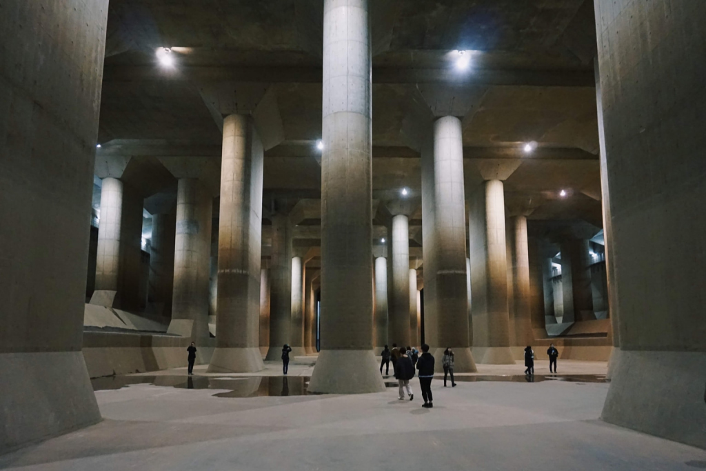The Metropolitan Area Outer Underground Discharge Channel is the largest underground flood prevention system in the world. It features an impressive 22m deep pressure adjusting water tank that is the size of two football fields, and five water intake banks, the largest being over 70 meters deep. The whole system of tunnels, water intakes and the pressure adjusting water tank covers a total length of 6.3km and has the ability to pump the equivalent of an olympic-sized swimming pool of water into the Edo River every 12 seconds. This massive engineering feat is emblematic of Tokyo’s long-standing effort to reshape the Kanto Plain into an increasingly safe and livable metropolis.