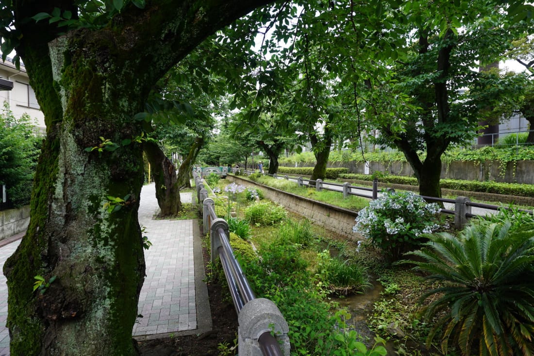 Nomigawa Waterpath and Green Road is a path along a brook that covers a lot of ground from near Sakura-Shinmachi Station all the way into Meguro ward. The little waterway is shallow and slow moving so children often play under the sakura trees in the brook catching insects and fish. The whole area is peaceful and reminiscent of a small town. As you continue down the path, you can find a variety of flowers, fountains and places to rest. It is the perfect place for a leisurely walk in any season.