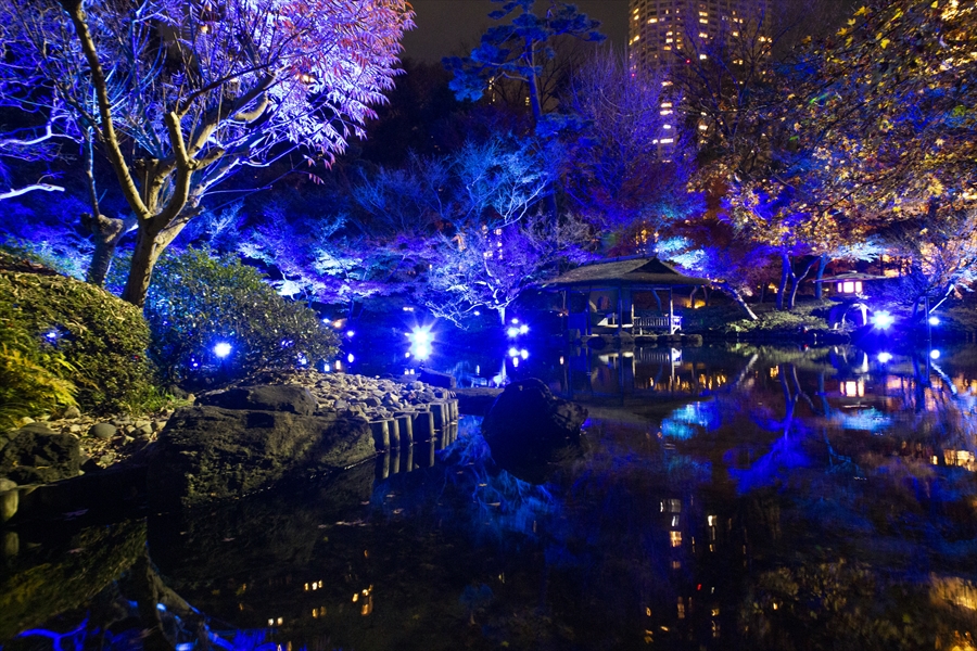 Gaze at a wintery scene illuminated in various shades of blue at Happo-en, a 400-year-old Japanese garden.