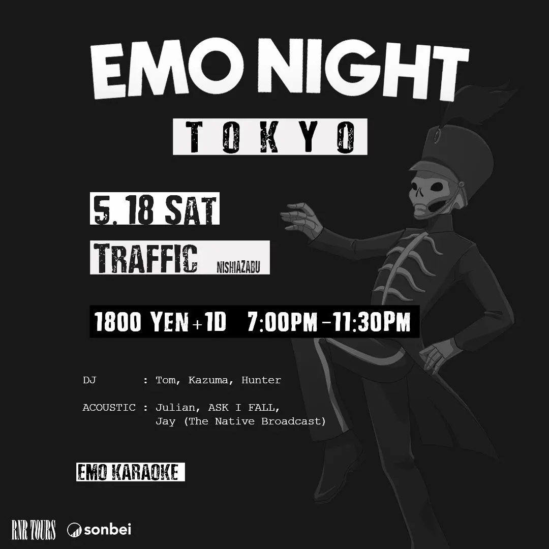 The saddest party in Tokyo. Emo Night Tokyo is a place for those seeking nostalgia and connection with emo, alternative, rock and metal music. At Emo Night Tokyo, bands and DJs spin tunes that resonate with your teenage soul. This event includes both local Japanese and international bands, where music unites cultures, emotions and people.| Date & Time | May 18, 2024・19:00-23:30 |