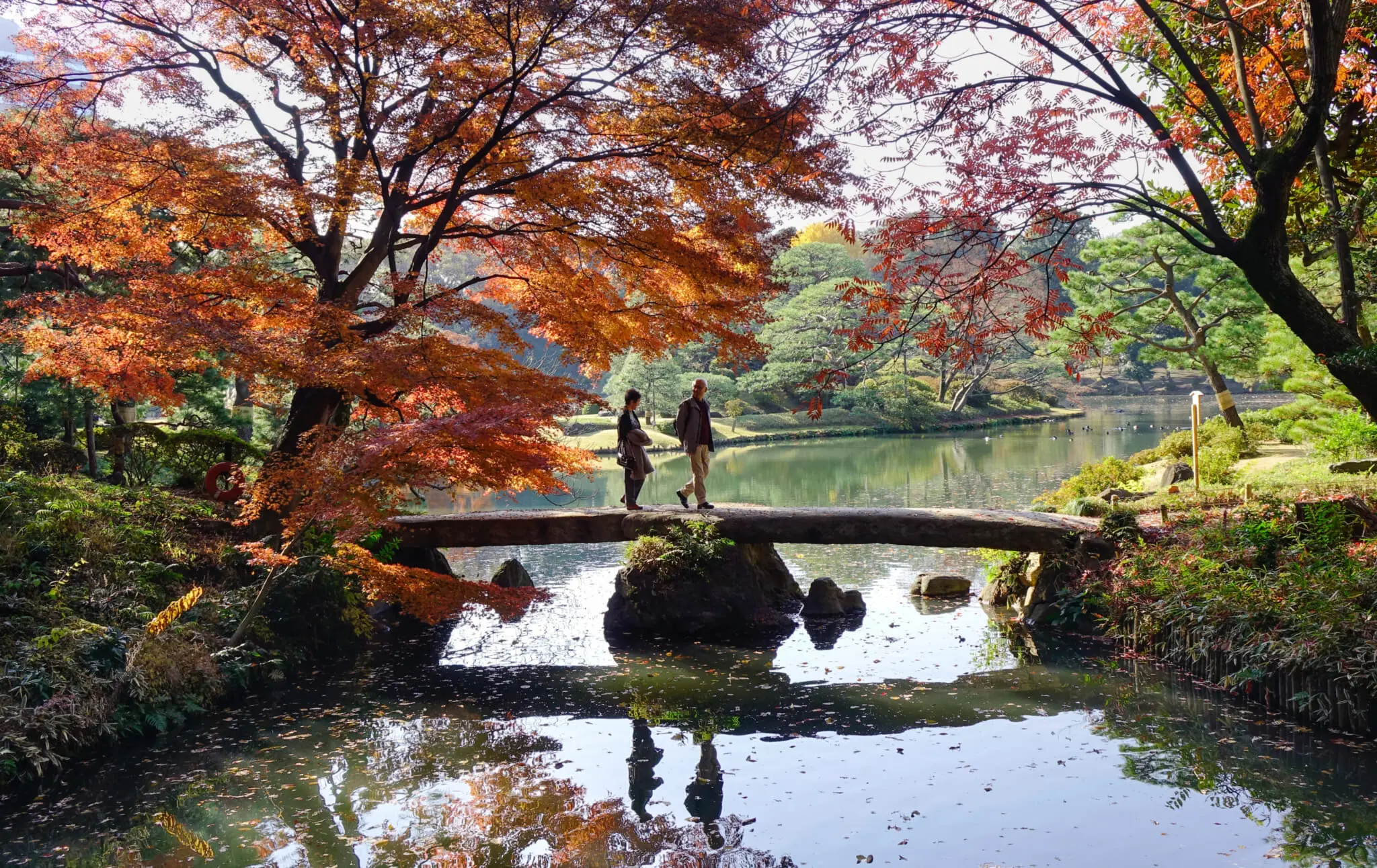 Depending on the month, the garden highlights the season’s charming flora and fauna. In February, you can enjoy the quiet beauty of pine trees, and depending on the year, blooming plum blossom trees. Rikugien is also known for its breathtaking weeping cherry tree, which typically blossoms in late March. There’s also the Meiji-era teahouse, Tsutsuji no Chaya, that is surrounded by fiery red maples in the fall. Togetsukyo, a stone bridge named after a famous waka poem, is also a gorgeous backdrop year-round.