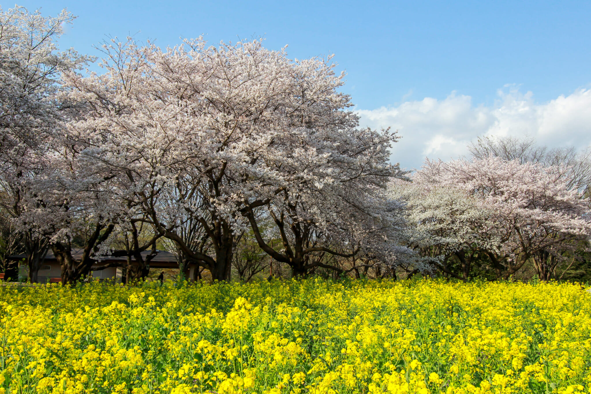 Around the start of April, the park boasts many different types of flowers, including rapeseed and cherry blossom, which are located next to each other on the north side of the park. This makes for a gorgeous contrast of buttercup yellow bed canopied with fluffy pink clouds. Any designer will tell you that this combination is far from ideal, but when it comes to nature, anything goes. And it looks magical.