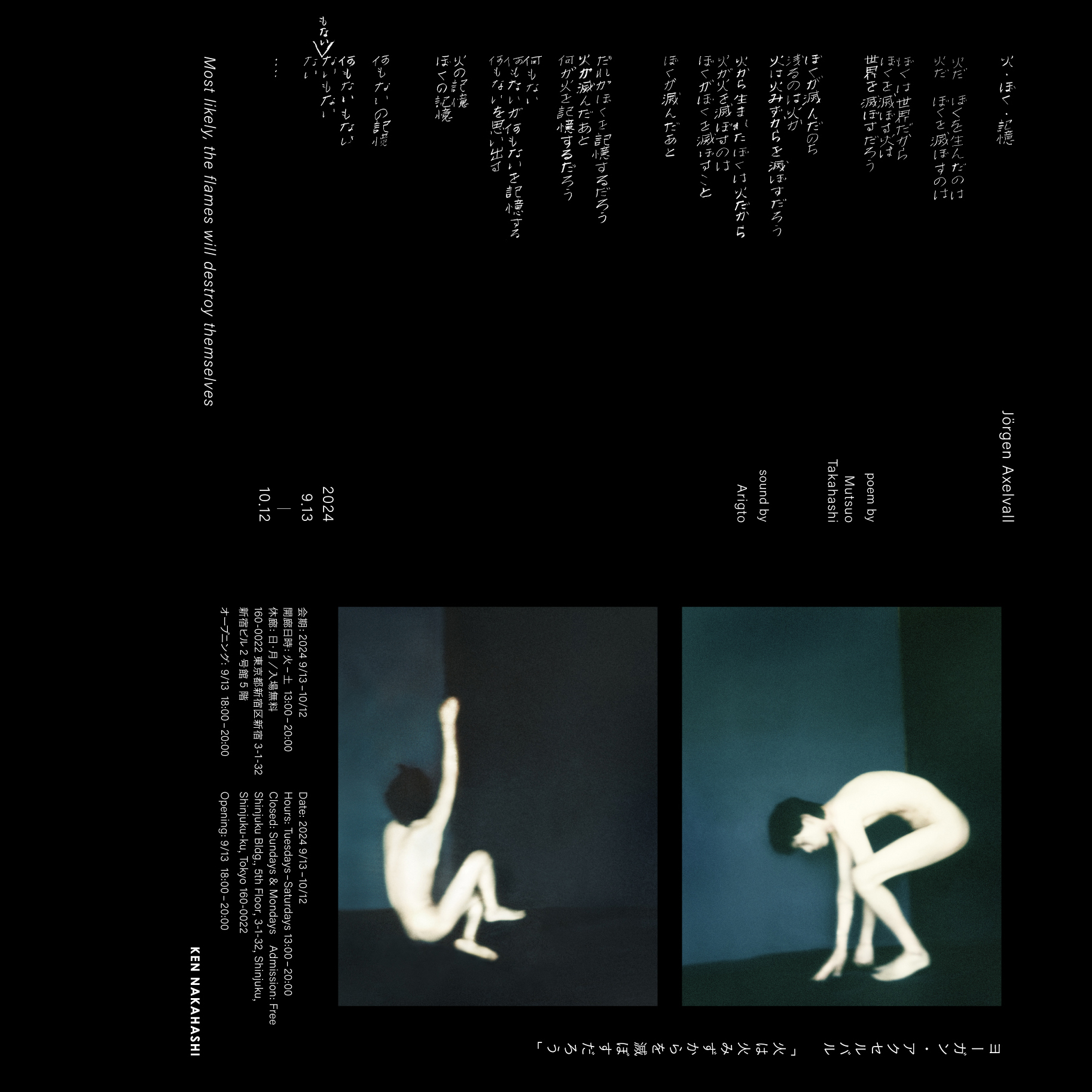 Ken Nakanishi is currently presenting "Most likely, the flames will destroy themselves," a solo exhibition by artist Jörgen Axelvall.