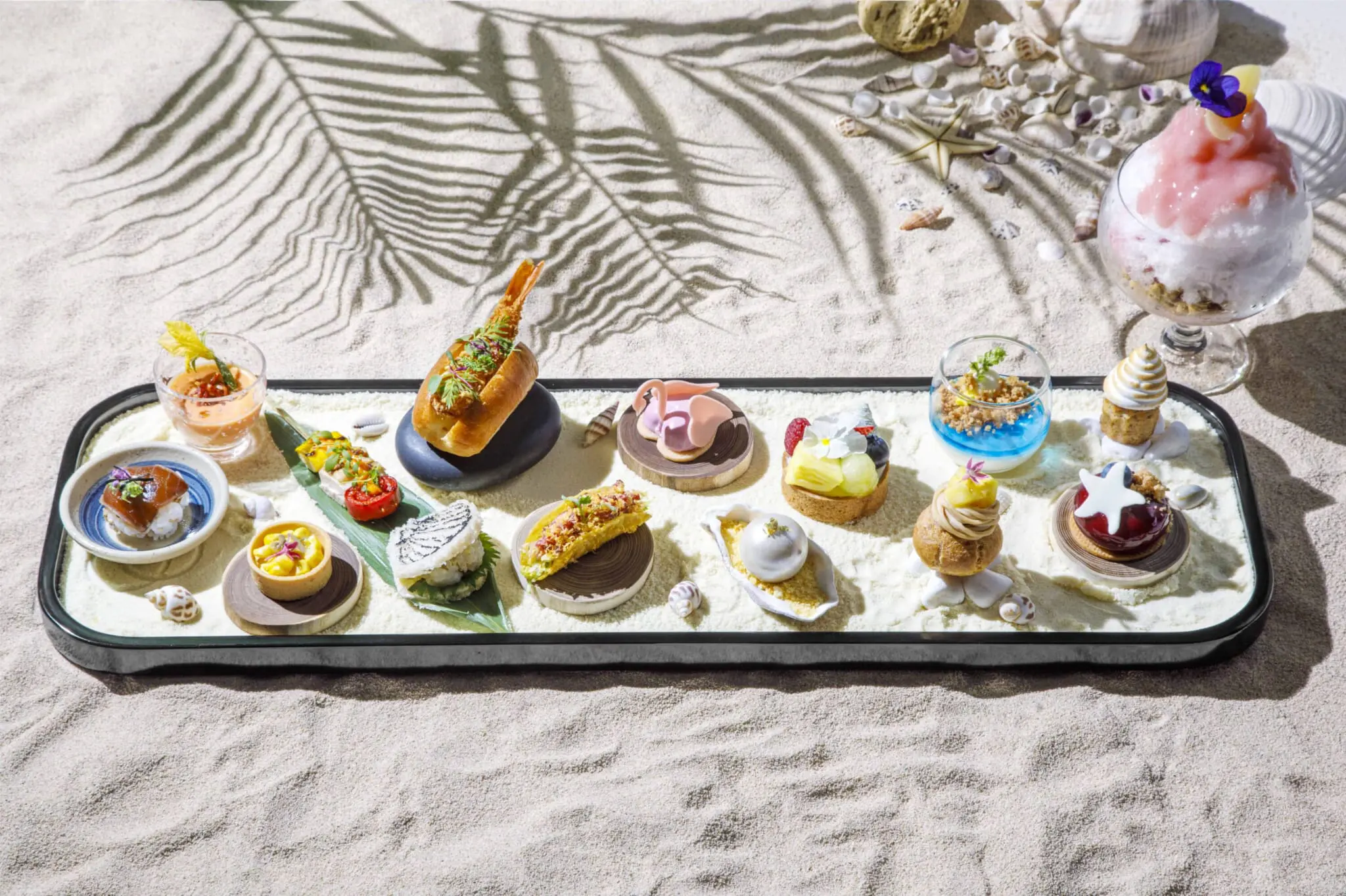 Aiming to bring the beach to the center of Tokyo, The Peak Lounge’s 2023 Signature Summer Afternoon Tea is full of delightful creations imagined by Executive Pastry Chef Julien Perrinet and his team, like a vanilla and strawberry cake shaped into a flamingo buoy, a blueberry fromage mousse topped with a white chocolate sea star, and a lifelike chocolate cream pearl in a beautiful oyster shell. Finish with a refreshing peach-infused shaved ice.