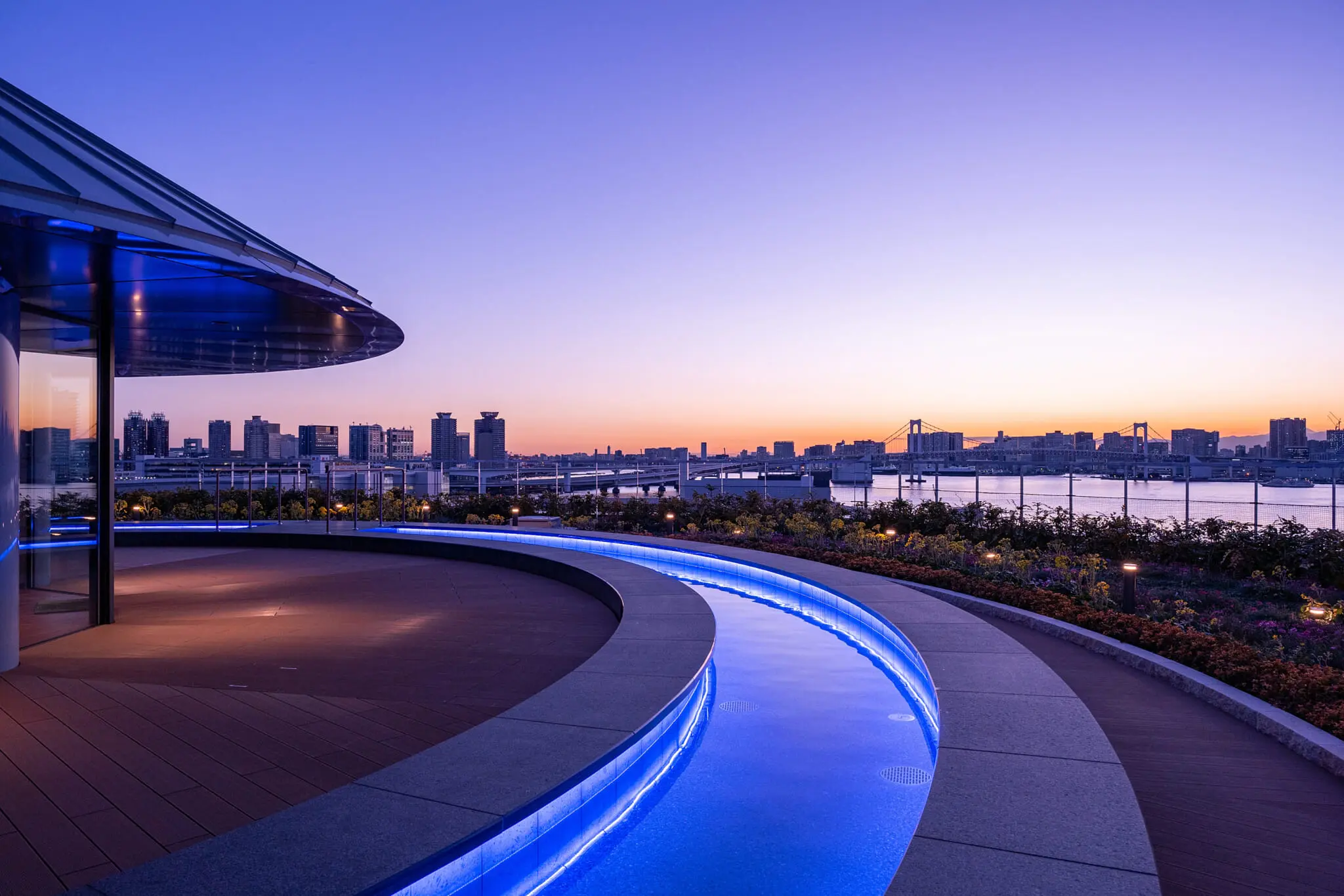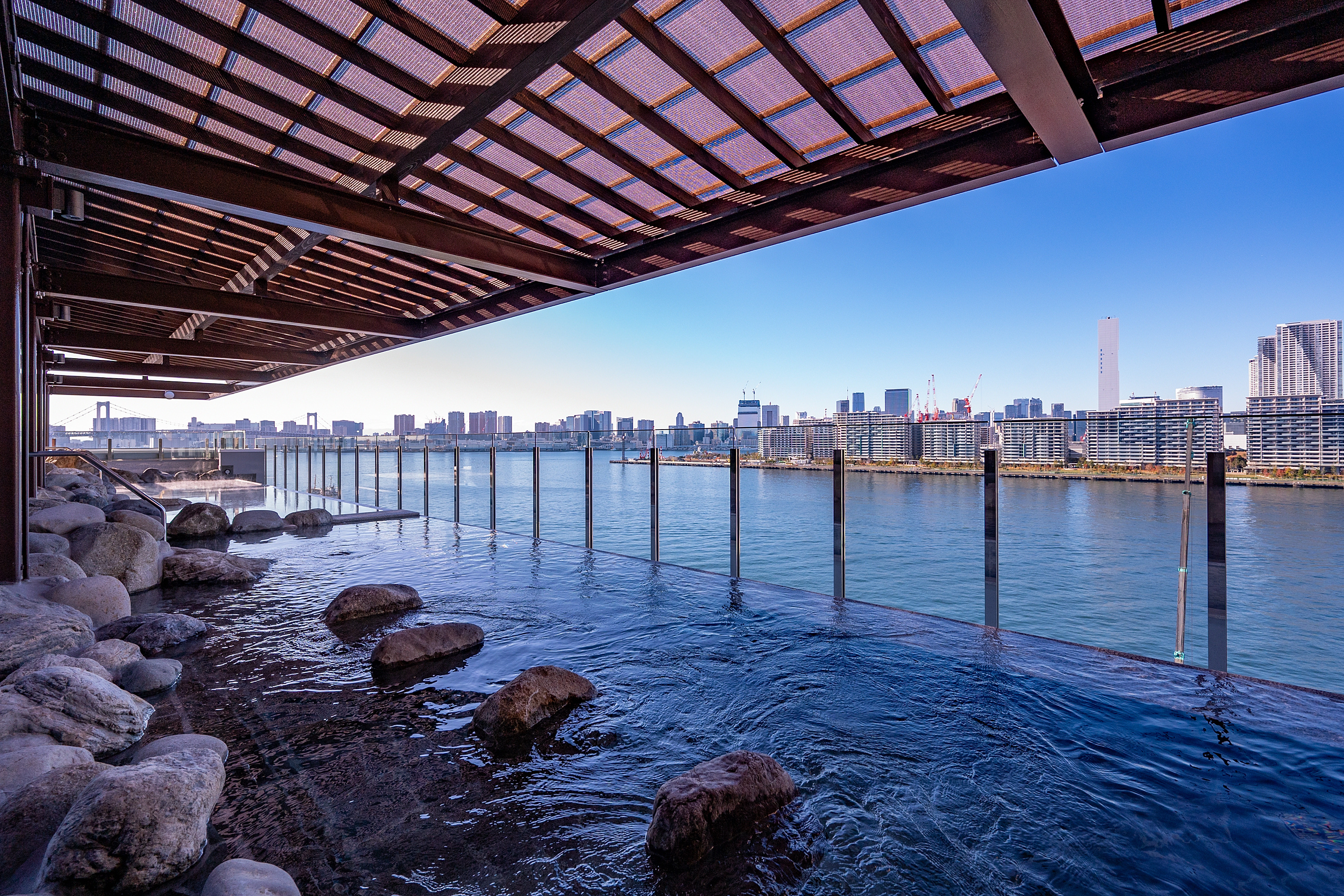 As you walk through Toyosu Plaza and the Mekiki Yokocho, you come to the entrance of the Manyo Club. Despite its location in the heart of Tokyo, the Manyo Club prides itself on providing its visitors with the same restorative experience that you might have while sojourning in one of Japan’s luxurious onsen towns, nestled in the heart of the mountainous countryside. In fact, the water that fills the baths here is transported from two of Japan’s most revered onsen locations: Hakone and Yugawara. Two to three times a day, up to 60 tons of this fresh onsen water, known for its velvety texture and skin-beautifying properties, is delivered to the Manyo Club to supply the baths.