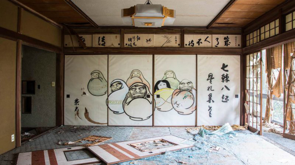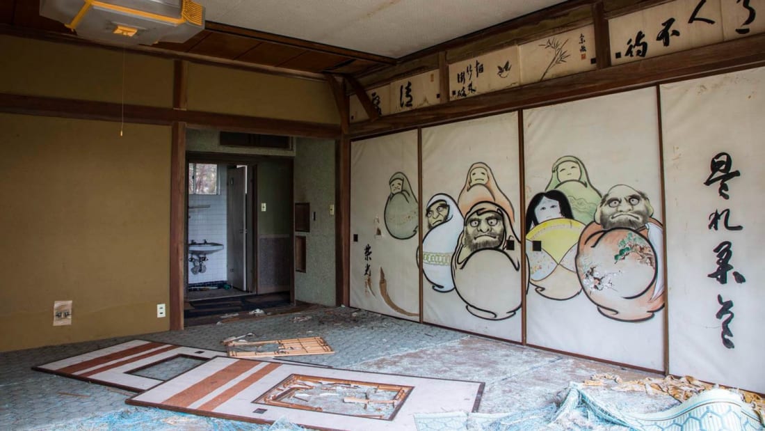 A small apartment in central Japan, it was once the home of Buddhist monks from the local temple. They hand painted their shoji (sliding doors) with depictions of Daruma dolls— round dolls modeled after Bodhidharma, the founder of Zen Buddhism. On the other side is a dragon flying above crashing waves. The murals have been preserved since 1976, despite the current state of the apartment.