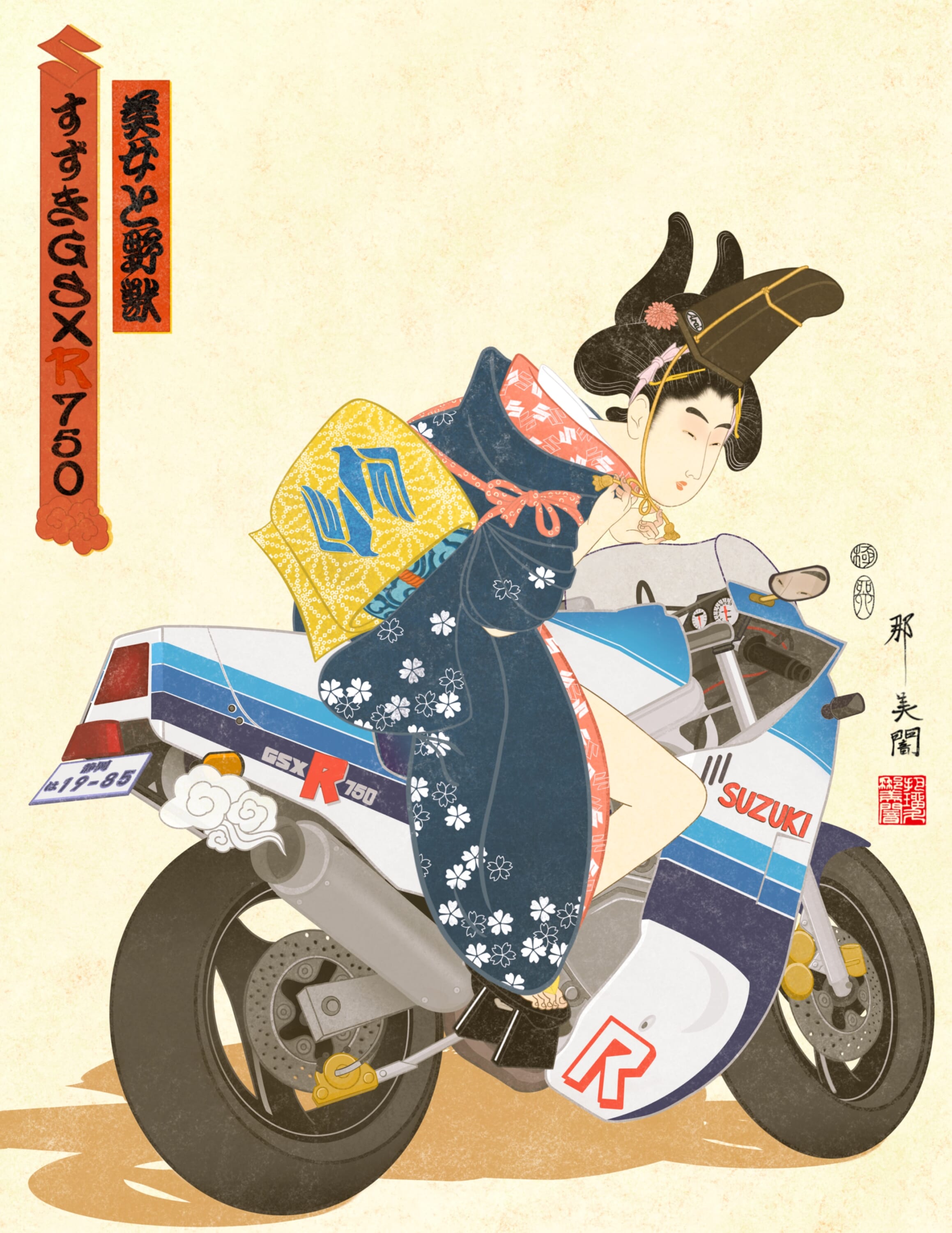 Ukiyo-e, bijin-ga, Japanese traditional fashion and, most recently, old Japanese motorbikes. I always enjoyed drawing cars and motorcycles as a kid, and I regained interest this year when I started my series “Beauty and the Beast,” which combines legendary motorcycles and women wearing kimonos. Recently, I undertook an exciting project for a Belgian car club exclusively dedicated to Japanese automobiles. Inspired by the project, I found my new challenge: crafting racing car liveries infused with the essence of ukiyo-e and Japanese tradition.