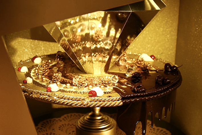 Elsewhere in Ginza Six, while there will be Christmasy sweets for sale in the Basement 2nd floor depachika, it may be the Christmas cake art that grabs the headlines. The ‘Merry Christmas Cake Boxes’ sound nominally uninspired, but they’re a pretty eye-catching and unique pair of artworks: rotating boxes of gilded metal, drooping chocolate designs and dancing mechanical berries that bring to mind a steampunk baker colliding with a hall of mirrors.