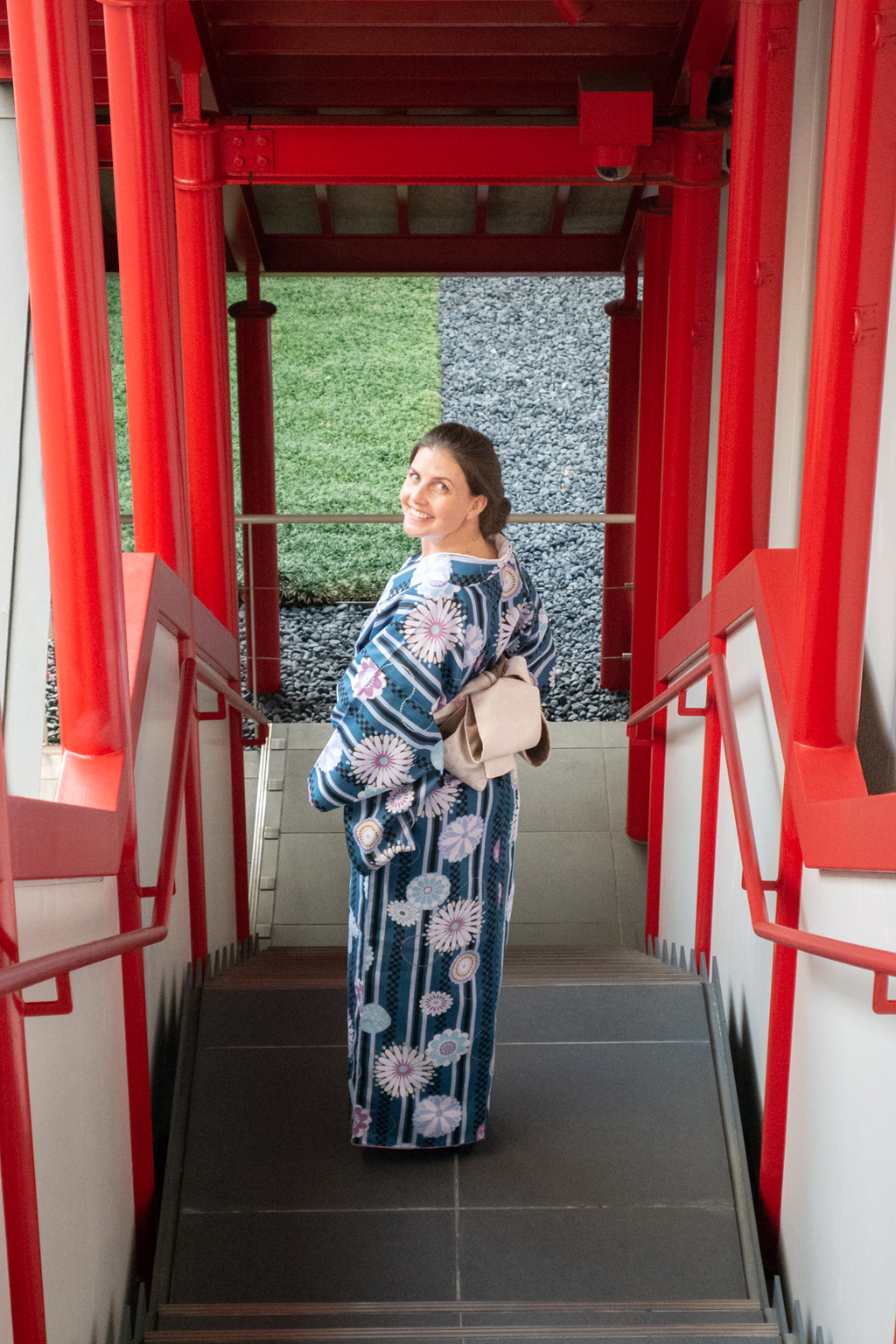 The kimono is fitted in a private tatami-floored space out the back. Here your chosen kimono will be expertly cinched and tied and readjusted in a way that only learned hands can perfect, until the one-size-fits-all garment appears as if it were custom made for you. I was brought to the styling area to have my look completed with an up-do and final hair accessory. The whole process takes about an hour – allowing you to take your time choosing a combination of colors, styles and designs that speak to you, and seeing every step that goes into the process.