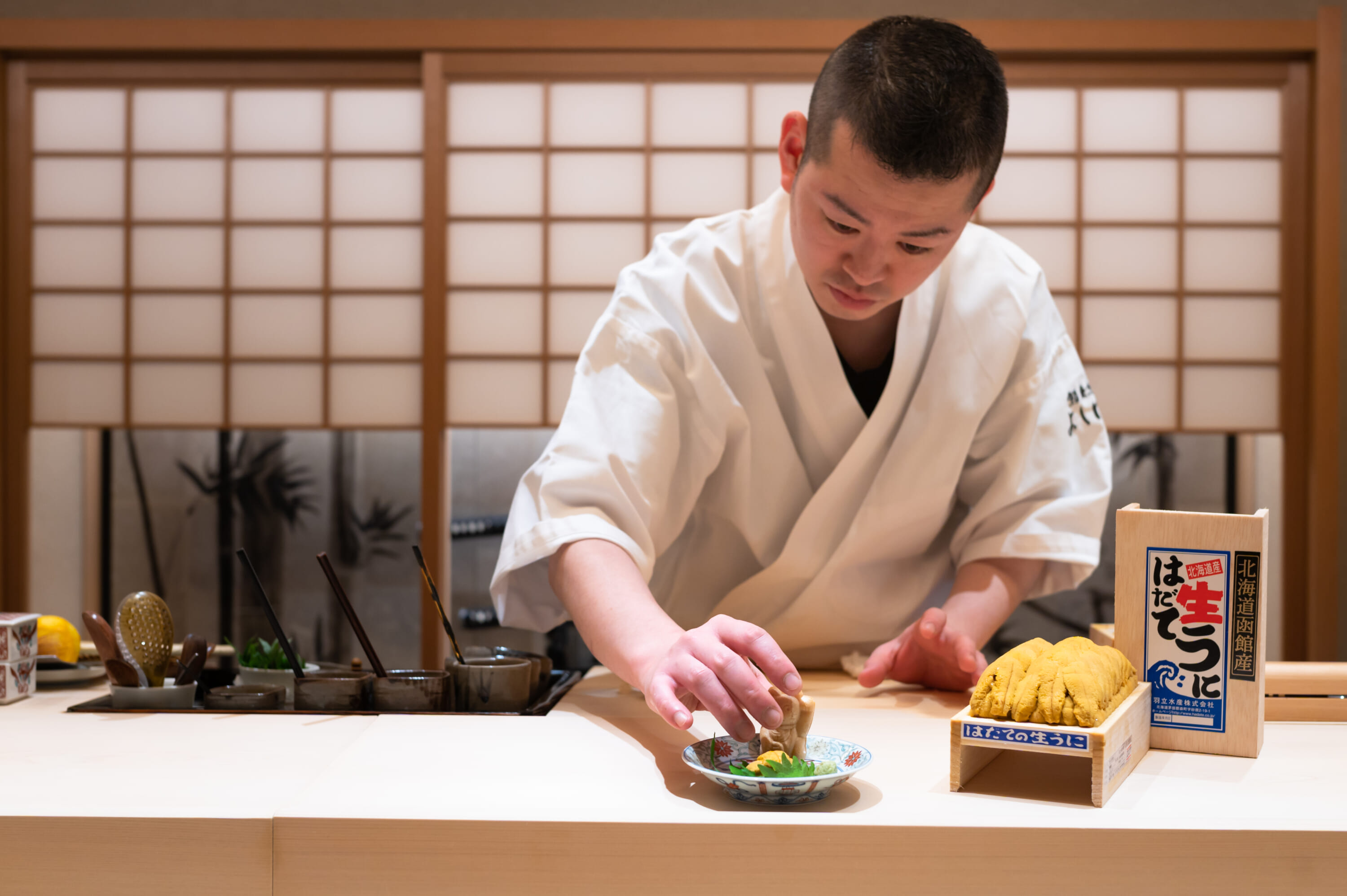 Sushi Tokyo Yoshida opened in the relatively quiet and inconspicuous Shibuya neighborhood of Hatagaya in June 2021. Housed in a three-story building on a traditional shotengai and nestled amongst rice dealers, greengrocers and barbers, the restaurant is not located in the sort of environment you would expect for such an upscale restaurant. There is nothing showy about the exterior, but there doesn’t need to be, as Sushi Tokyo Yoshida has a reputation for serving some of the most delectable dishes imaginable alongside wonderful wine and sake.