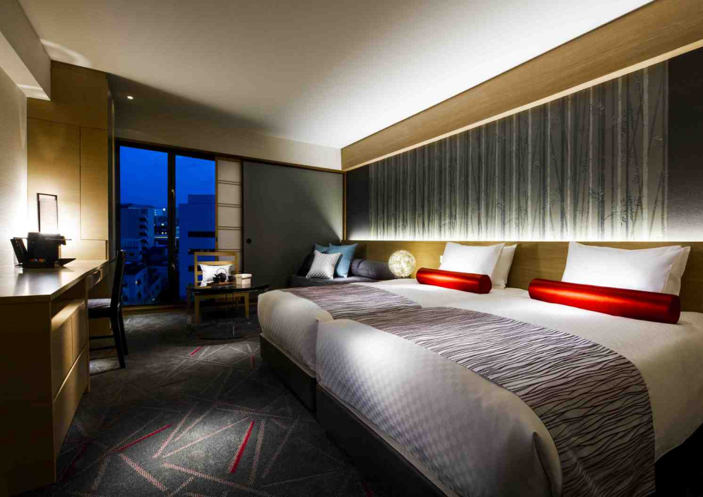 First opened in 1969, the Rihga Royal Hotel Kyoto has been recognized has long been recognized as one of the premier hotels in the city. It features an elegantly louvered ceiling and a paved stone floor; meanwhile, the reception desk is fashioned from dramatically red lacquer. It has a total of 489 rooms, and a new premium floor on the 9th floor called Chikurin no Kazaoto.
