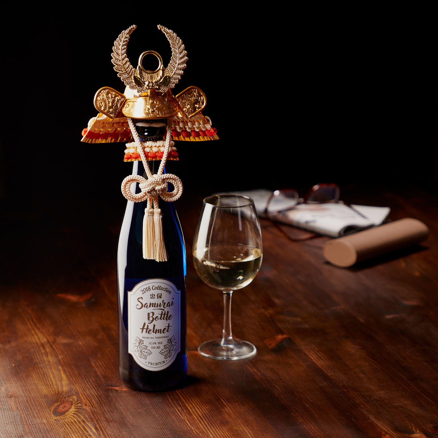 Made with gold metal, gold leaf and braiding, and using the same traditional techniques employed to make samurai armor in Koshigaya, Saitama Prefecture, this samurai bottle cap brings a decorative twist to sake and wine bottle stoppers.