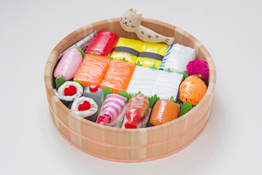 Got a baby shower coming up? What more could any expecting mom want than an adorable diaper set designed to look like a sushi platter? Disposable diapers for sushi rice, an Imabari towel for tuna, a sponge for an omelet, an ice pack as salmon roe, baby socks as cucumber roll and more.