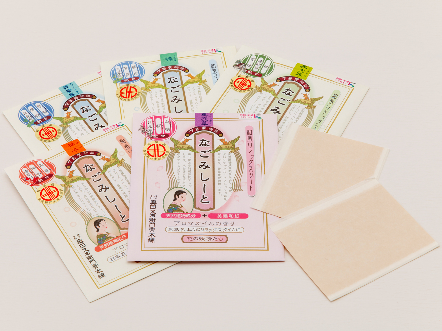 These sheets are a modern version of the medicinal compress sheets famously associated with Gero Hot Springs. Using essential oils and blending selected fragrances such as lavender, chamomile, rose and yuzu citrus, the sheets give a calming effect and a gentle aroma that is pleasant to the senses.
