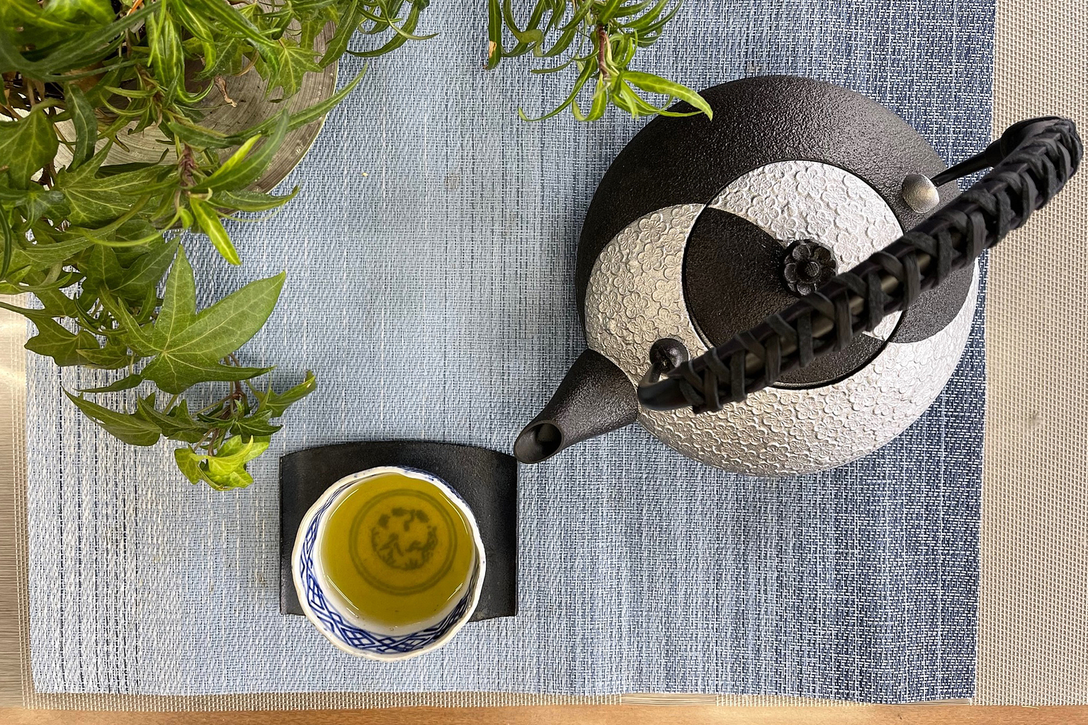 A key design aspect of this kettle is the lid, which can be rotated to enjoy the change in pattern. The plum-flowered half represents Yang (light), while the solid-colored half represents Yin (dark). Buy here.