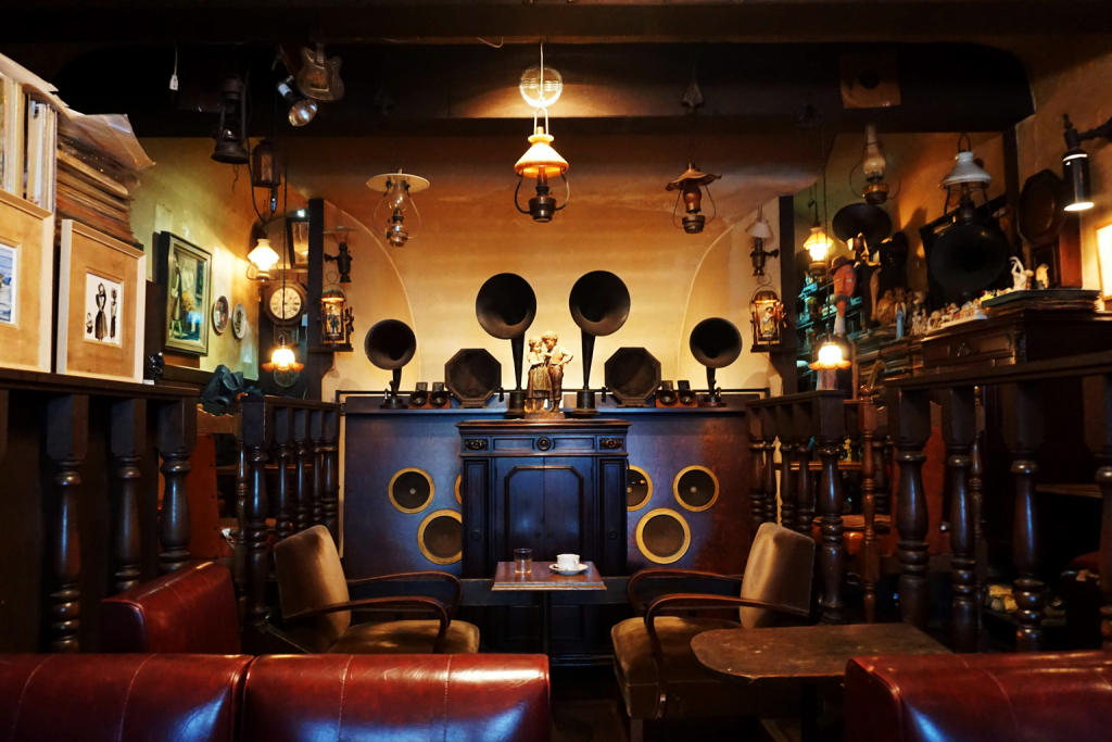 Like many of Tokyo’s remaining meikyoku kissa (masterpiece cafés), Violon is located in western Tokyo along the Chuo line about a five-minute walk from Asagaya Station. It seats about 10 people and there are a few seats along the walls. While the art, decor and ornamental wooden banisters add to the vintage spirit inside Violon, it is the speaker system resembling Victorian era steam machinery that immediately catches your eye and serves as a centerpiece.