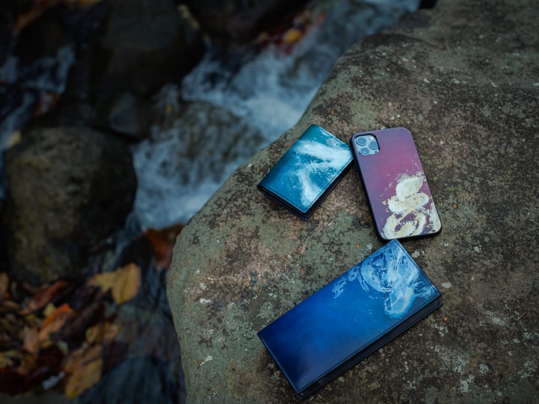 Or there is the series “Soul” (魂), which includes an iPhone case, a long wallet and a name card case. These items were made in limited quantities, in collaboration with calligrapher Koki Sugita, to celebrate the opening of yuhaku Ginza Gallery. Sugita’s rippling marks, even the tiniest, millimeters-long streaks, go nicely with the intricacies of the leather itself. With the dye they take on a luminous, even neon quality. It is difficult to believe these items are leather, without the suppleness to give it away. In the cobalt variation, the calligraphy looks like waves. The maroon leather with yellow-white streaks remind you of light painting.