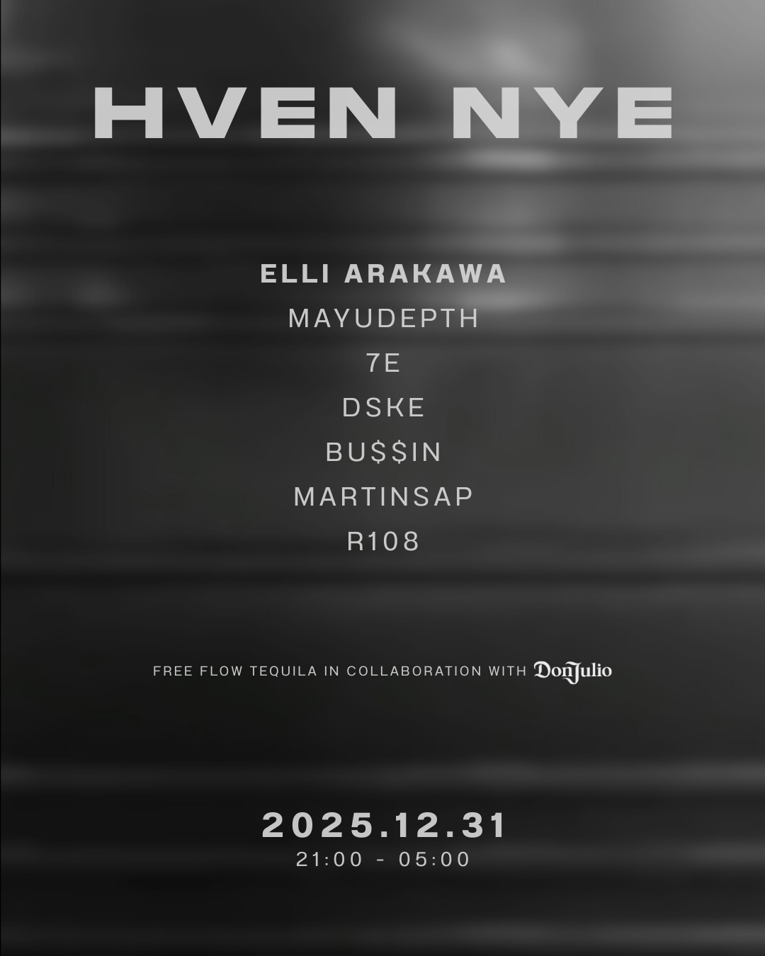 Celebrate New Year's at Hven with free-flow Don Julio. Techno/house DJs will perform with headliners like Elli Arakawa, Mayudepth and Dske.