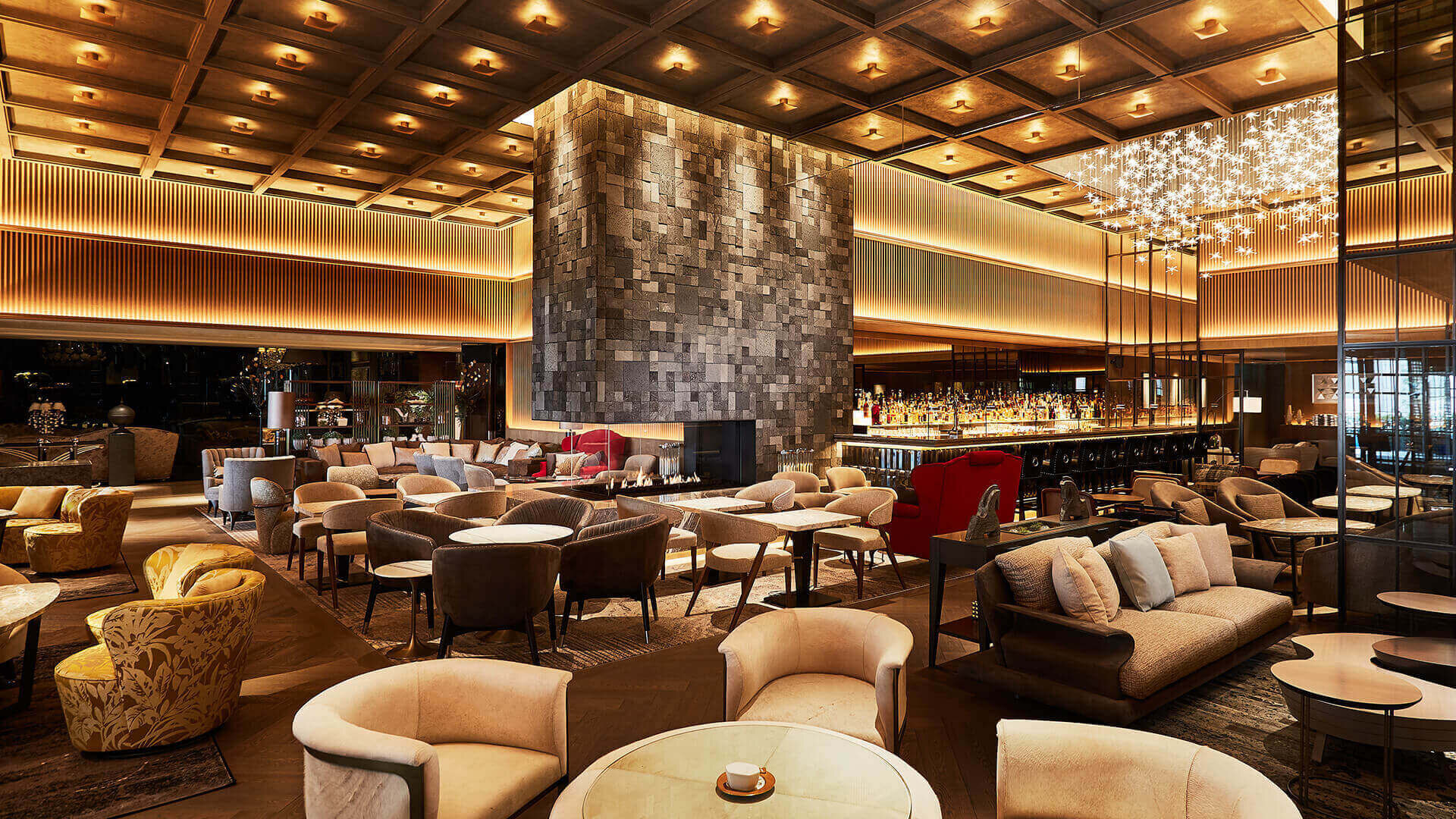 Inside the InterContinental Tokyo Bay hotel, Hudson Lounge offers one of the grandest fireside experiences in the city. The lounge features a soaring five-meter ceiling and a striking black lava-stone fireplace that anchors the room. Guests can enjoy cocktails, light meals, afternoon tea or simply unwind in the library-style corner in this hotel lounge that has a private club-feel.