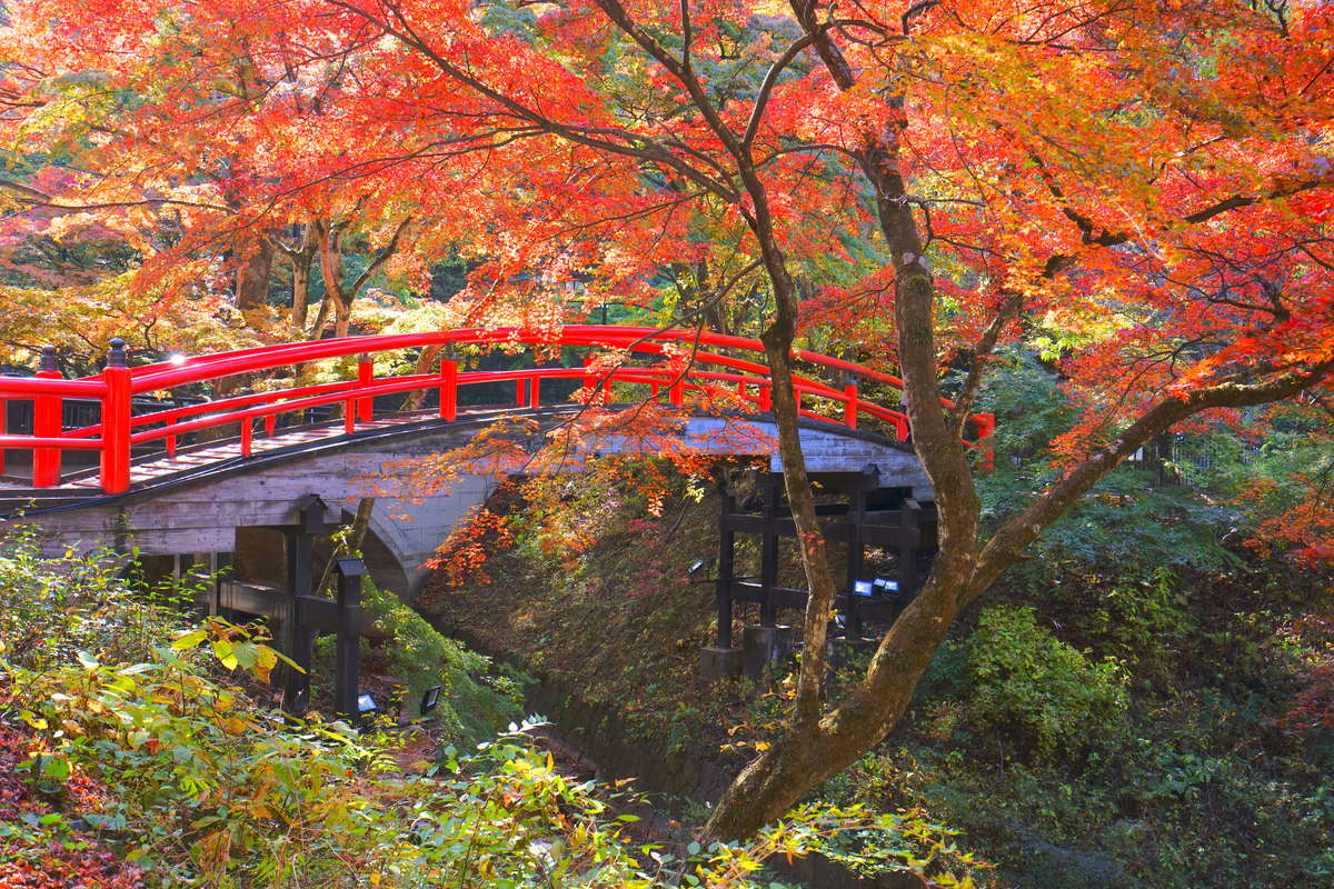 This bridge spans a narrow gorge on the east of Ibaraki and is a popular photo spot for rural tourists. The 60-meter-long bridge is suspended above a small stream, offering sweeping views of Hananuki Valley below. The trees create a vibrant canopy of reds as you walk across, and if you time it right, the bridge itself will be completely covered with a carpet of red and orange leaves.
