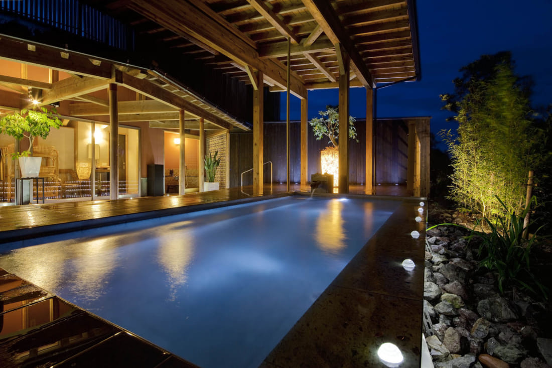 The complex has three private chartered hot spring baths, the most impressive of which is Ten no Kagami (Mirror of Heaven). One hundred square meters, it looks more like a lavish pool than an onsen and is a great place to enjoy panoramic views of the bay. There’s also Toki no Ie Aoi (House of Time), a delightful octagonal lounge where guests can unwind in a stylish environment featuring books, DVDs and refreshments. Another serene place to relax (if it’s warm enough) is the terrace, which is lit up with candles at night.