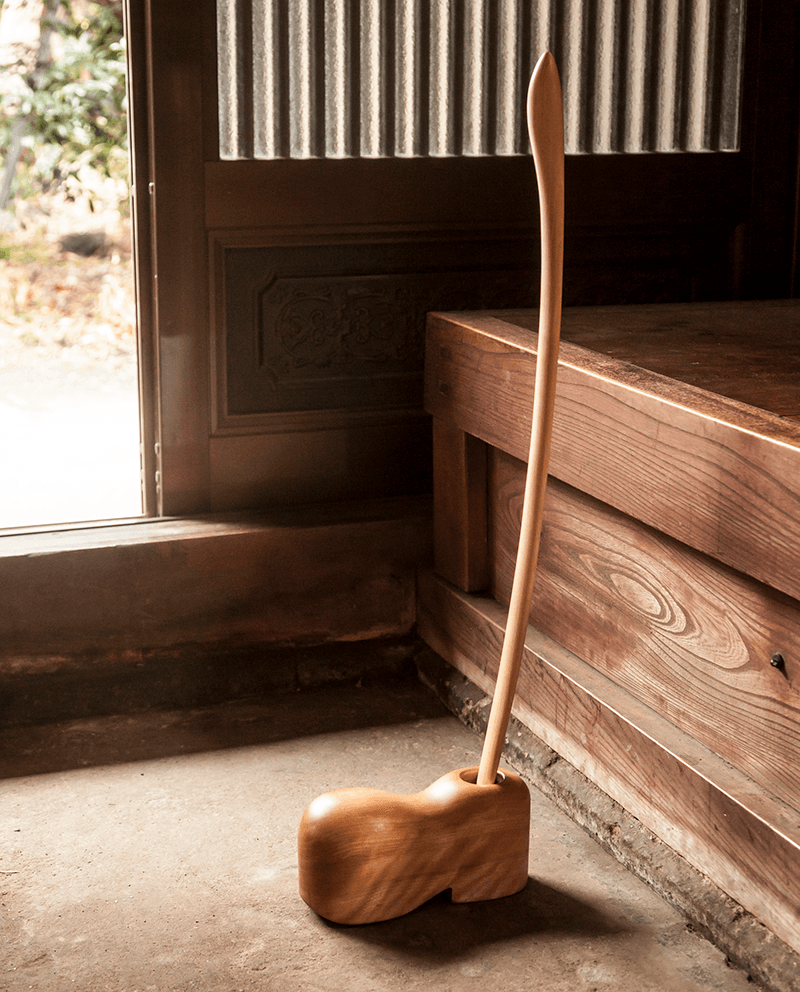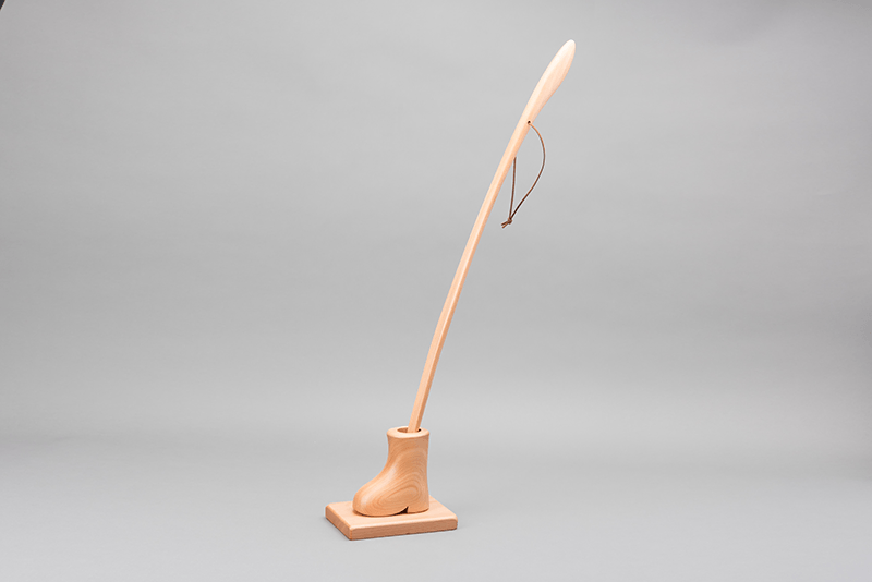 The wood known as ono-ore-kanba grows only 0.2mm each year, making it a rare commodity. Pieces made from this material are meant to be small treasures, and the smaller sized version of Artforme’s shoehorn is just that. Hashino makes each piece by hand, one at a time. The shoehorn is shaped to fit just right in the hand. Meanwhile, the small stand that the shoehorn rests in is made from local Tohoku hardwood, and is carved and polished into the shape of a tall boot. Over time, the natural wood color of the shoehorn will darken, adding even more character to the piece.