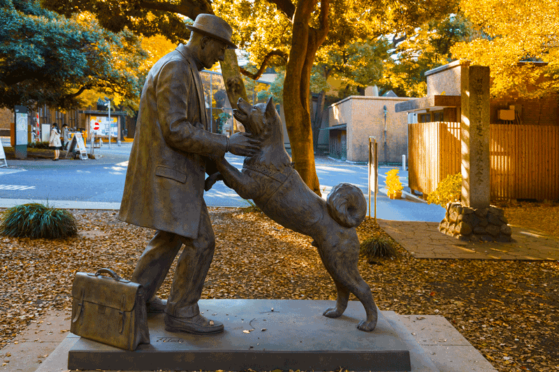 Hachiko’s remains were laid to rest next to Professor Ueno’s at Aoyama Cemetery. But before he died, he had already been honored for his loyalty: a statue of the dog had been erected in 1934. Reconstructed in 1948, Shibuya’s Hachiko is now a tourist destination as well as, quite fittingly, a meeting place. The dog has gone on to inspire another pair of statues: at the Akita Dog Museum in Odate (see far right), a statue in Hachiko’s likeness waits patiently, facing in the direction of the original Hachiko statue, more than 650 kilometers to the south. Finally, in March 2015, a statue was unveiled at the Department of Agriculture at the University of Tokyo, which depicts a meeting, perhaps in the afterlife, of Hachiko and his beloved master.
