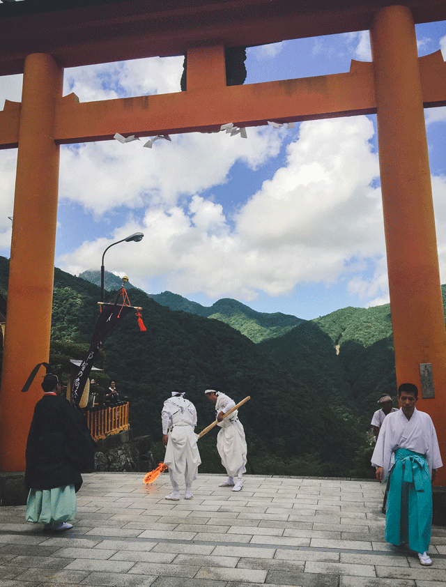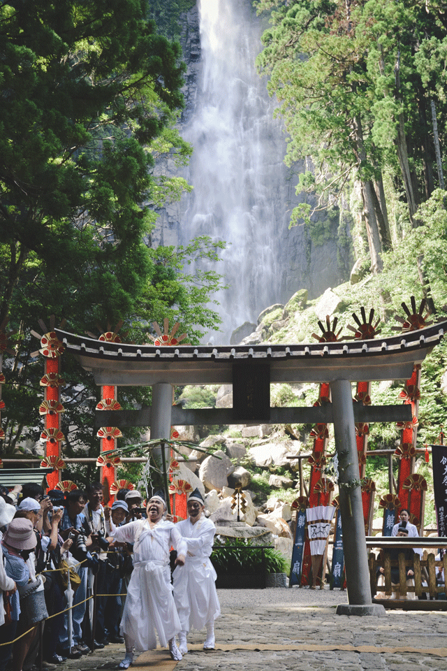 A priest, his face painted with hot ashes, marches across a cobblestone path, his voice ringing out, drowning out Nachi Falls: “Sen nen appari!” He calls our for a blessed eternity. Voices echo his wishes, and chant along with him. He marches in a circle thrice before retiring; a flutist plays for a moment while onlookers, sweaty from the humid July air, feel the mist from the falls on their faces. The song comes to a lull, then there is stillness.