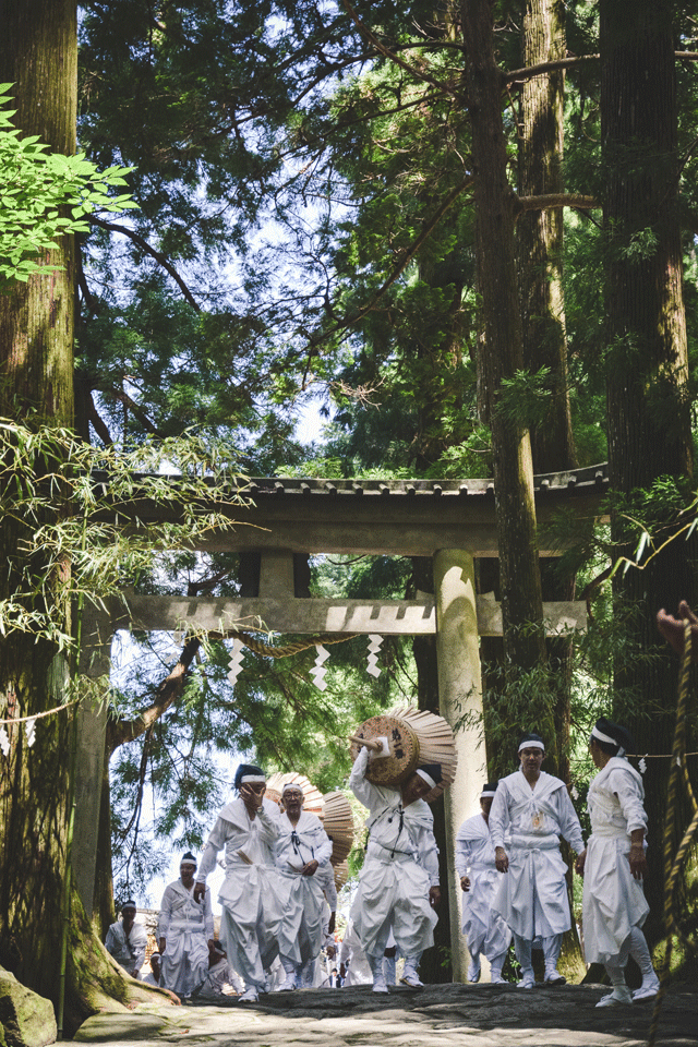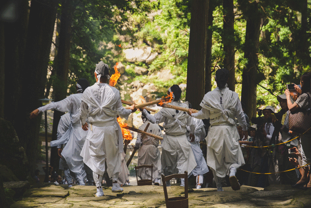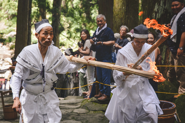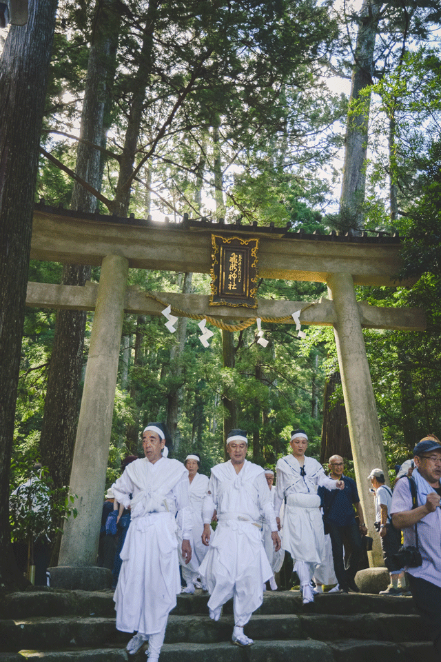 Volunteers and those receiving training pass through the Torii Gate of Hiro Shrine, ready to retire at the top of the mountain. Throughout the day they were cheered on, and celebrated as local heroes. Many visitors clamored for photos and souvenirs from the fire-bearers, asking for fans and pieces of the burned torches.