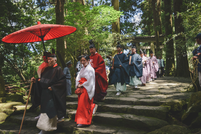 The head priest, flanked by a miko and attendant, strides down the mountain to bless the torches just before they are lit.