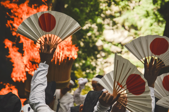 The raised fans, the same ones used to fan the flames, are the only prop used in the dance. A drum steadies the rhythm of their movements, and a flutist guides them through the steps (Nachi no Dengaku).