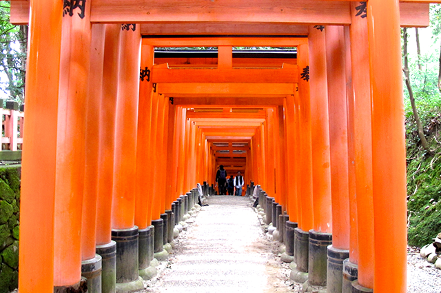Fushimi Inari is a popular shrine at the base of a mountain in the southwest part of Kyoto. There are walking trails up the mountain with beautiful torii gates leading the way. Hundreds of smaller torii gates, engraved with the names of families or companies who donated them, line the mountain to form a picturesque “torii tunnel” for visitors to walk through during the gradually ascending trail. Small steps and even surfaces allow for a fairly easy and painless hike up the mountain.