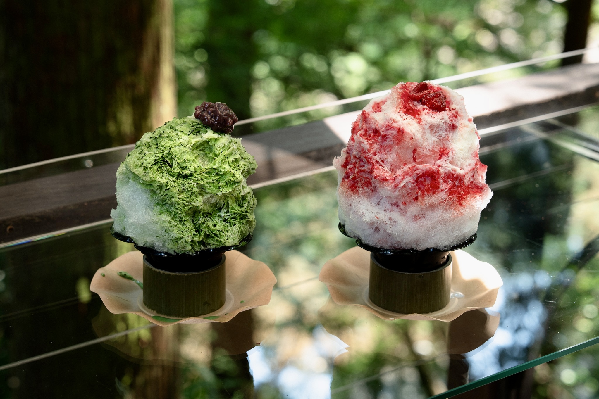 In the warmer months, the highlight is Rakuan, a seasonal shaved ice stand tucked in the gardens. Using natural ice, slowly frozen in winter using pure spring water drawn from deep underground. The ice is shaved to a soft, snow-like texture and topped with syrups handcrafted by the restaurant’s chefs. In summer, two flavors are available: strawberry milk, made with real fruit and condensed milk, and azuki matcha milk, topped with sweet red bean and rich green tea syrup.
