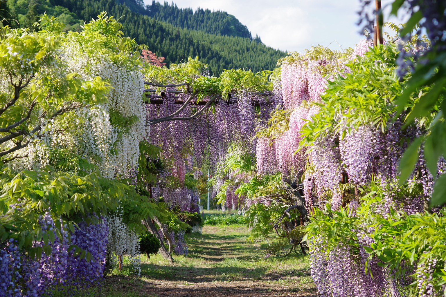 Tonose Fuji no Sato in Odate city has the word “fuji” (wisteria) right in its name. Locals also lovingly call it “earthly paradise,” as it’s a secluded place full of naturally growing wild wisteria trees. During May, white, pink and purple flowers hang from the climbing branches, and the air is sweet with their scent. The wisteria are surrounded by a forest and rice fields, immersed in the tranquility of nature. It’s free to enter, with the option to donate to its maintenance fund.