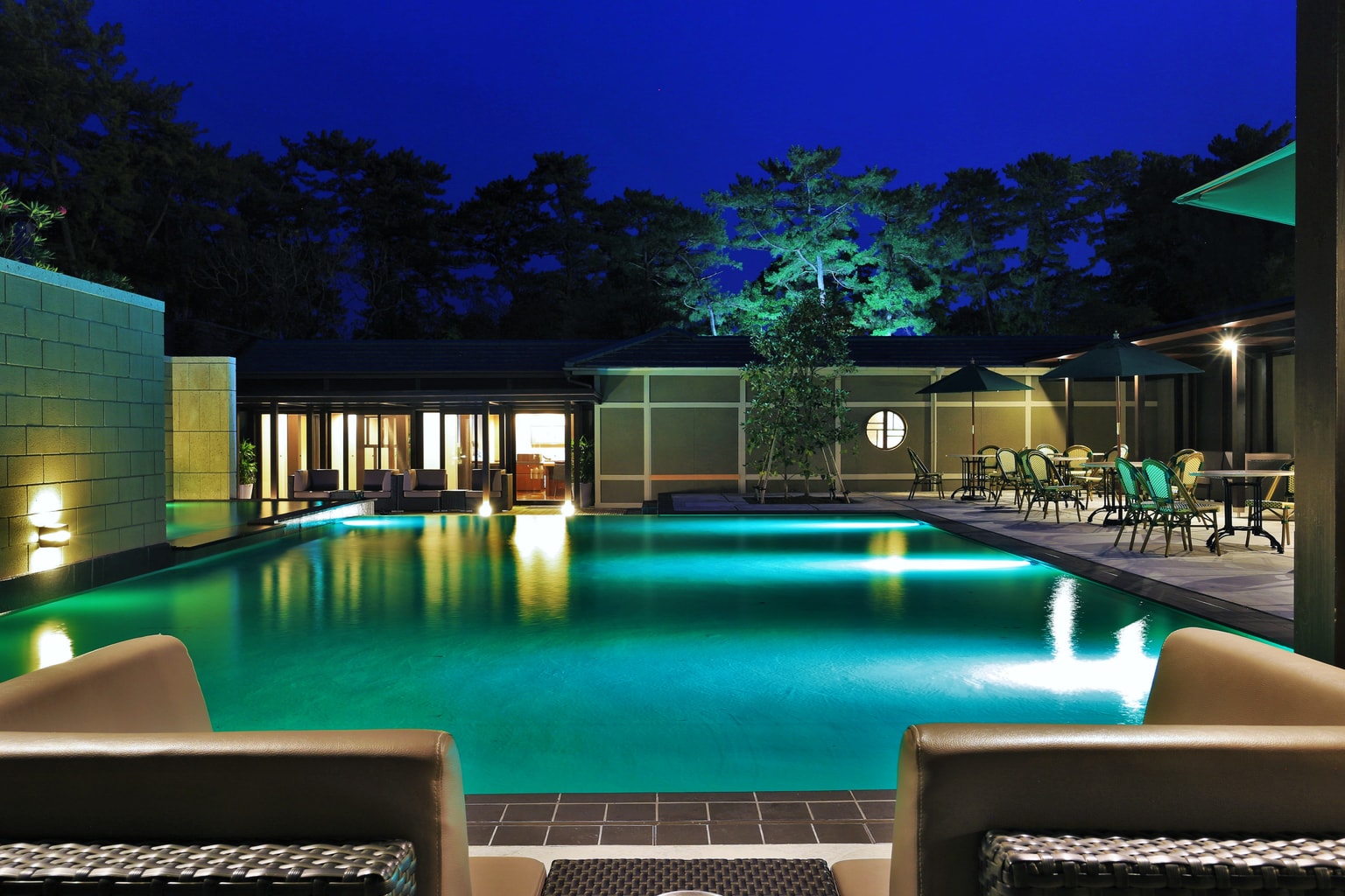 Post dinner, make your way to the resort’s poolside bar for a nightcap. Imbibe an original cocktail or sip on Japanese whisky as you sit and gaze at pine trees with light shimmering in the pool.