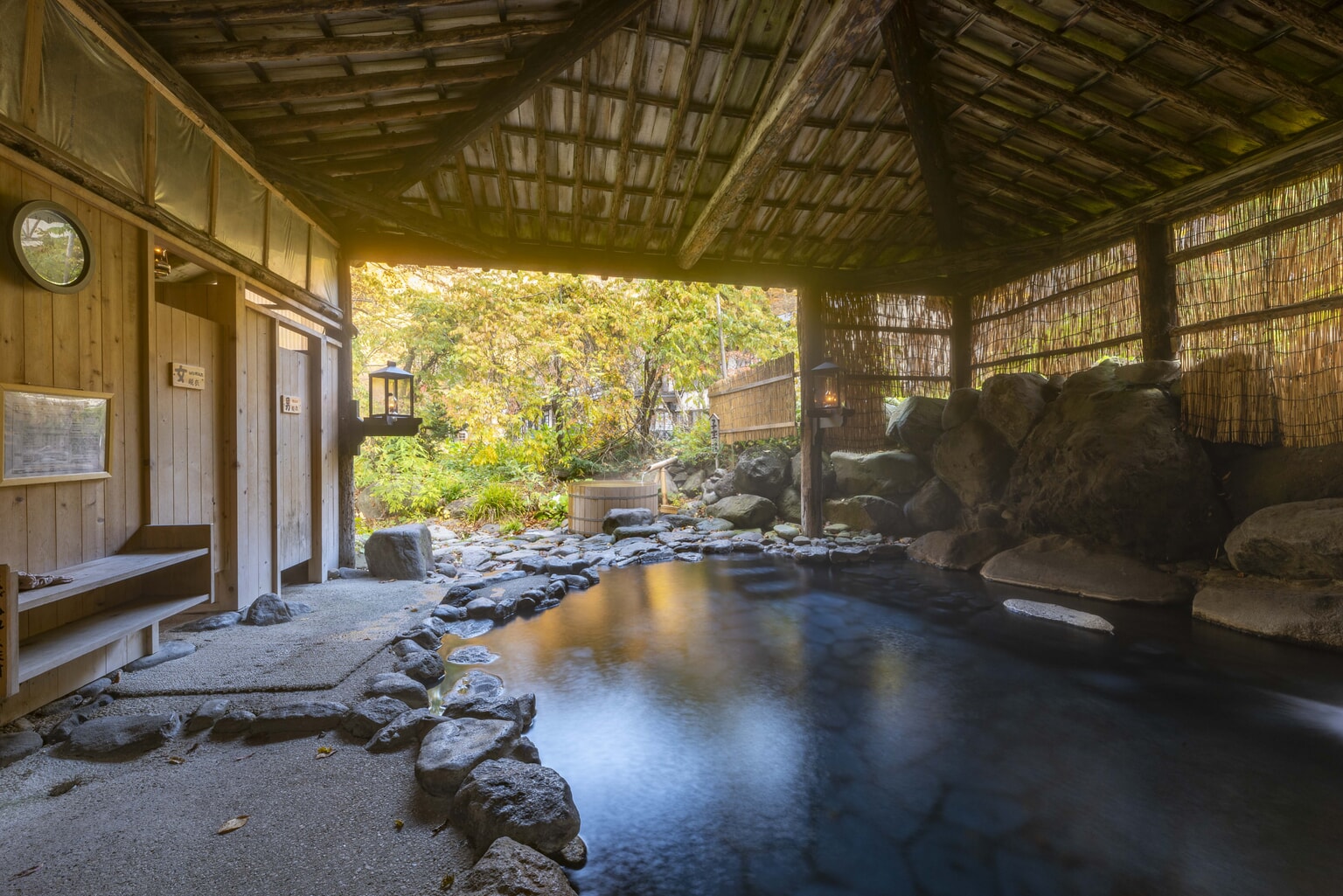 The next two baths are located out the back door. Slip into rubber slippers and cross the walking bridge over the cascading Aoni River. To the right is the indoor communal bath, shared by both men and women (though at certain times the bath is open only to women). The large pool is circled with rocks, and a private one-person wooden tub is located on the back patio, allowing you to hang your feet over the rim and gaze at the stars above.