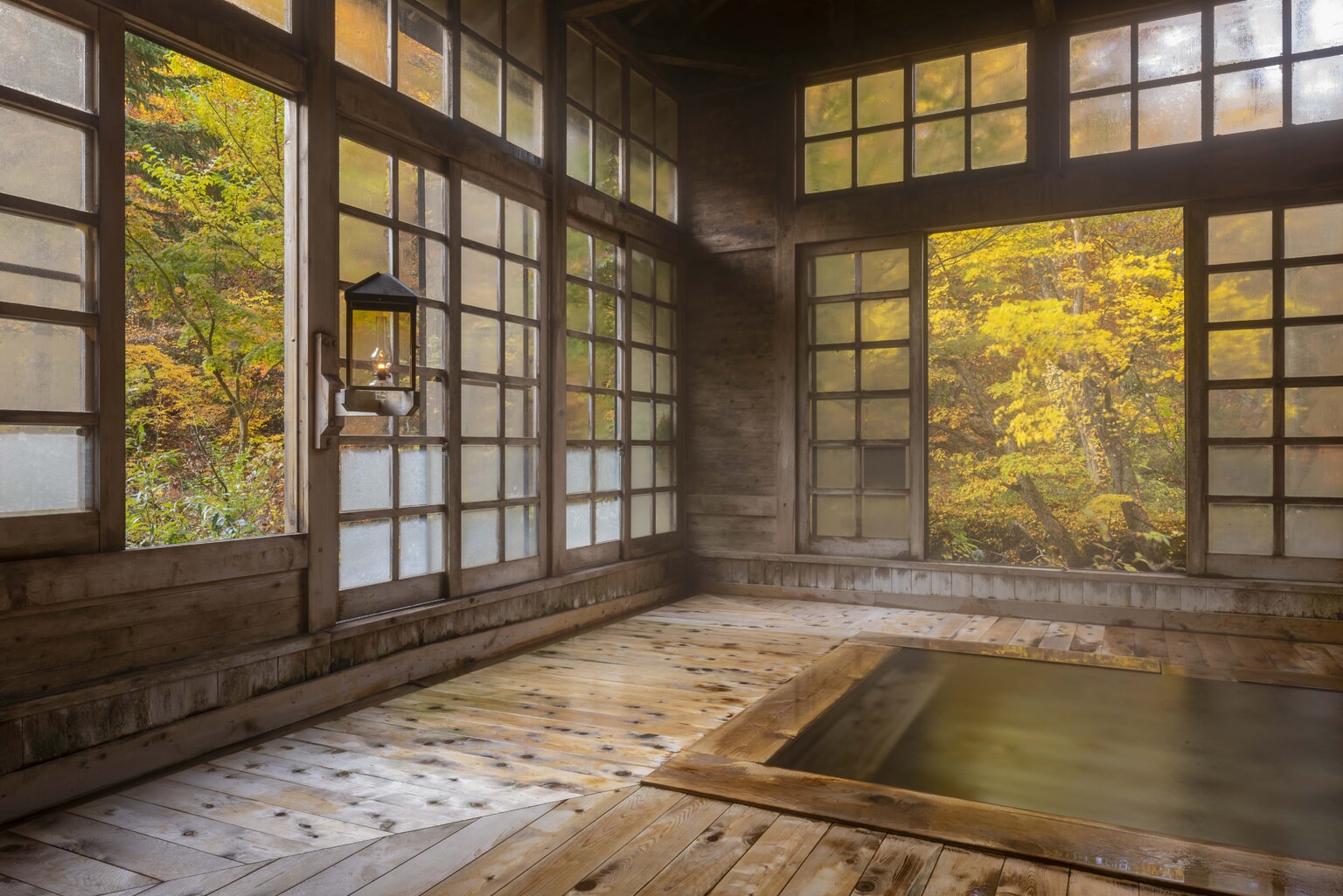 Inside the main building is the inn’s original hot spring bath. Until the inn was doubled in size in 1973, this small tub made from a local conifer tree was the only hot spring bath available. The wood has antibacterial properties, and the mineral-rich spring water was piping hot. The steam swirled above, filling the room.