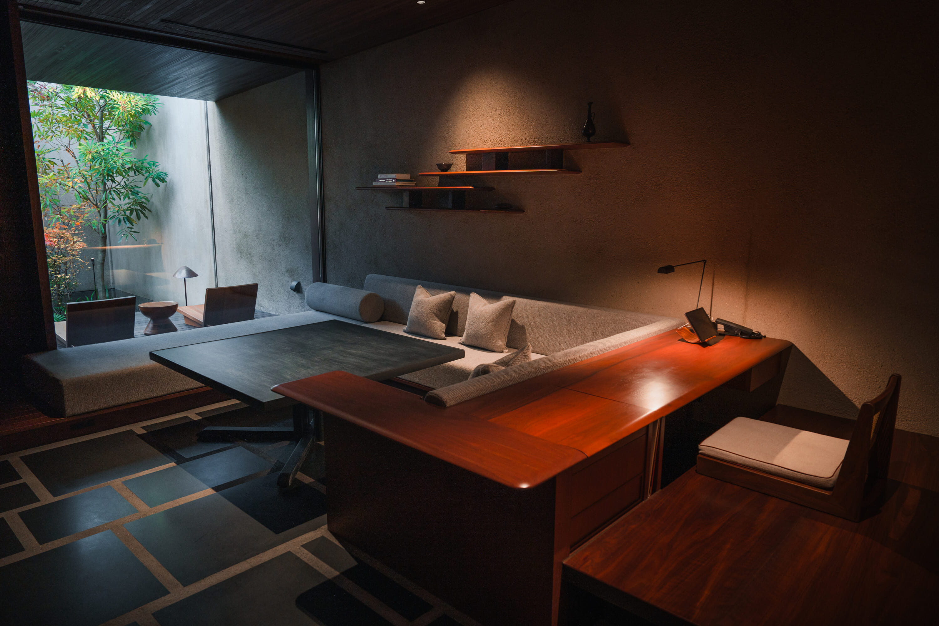 The rooms feel like private residences — spacious, deeply comfortable and composed with the same careful intentionality seen throughout the property. Natural textures dominate: pale woods, washi-like textiles, soft lighting that warms rather than illuminates. As a unique perk, each suite includes a dedicated massage room alongside a generous living space and private garden.
