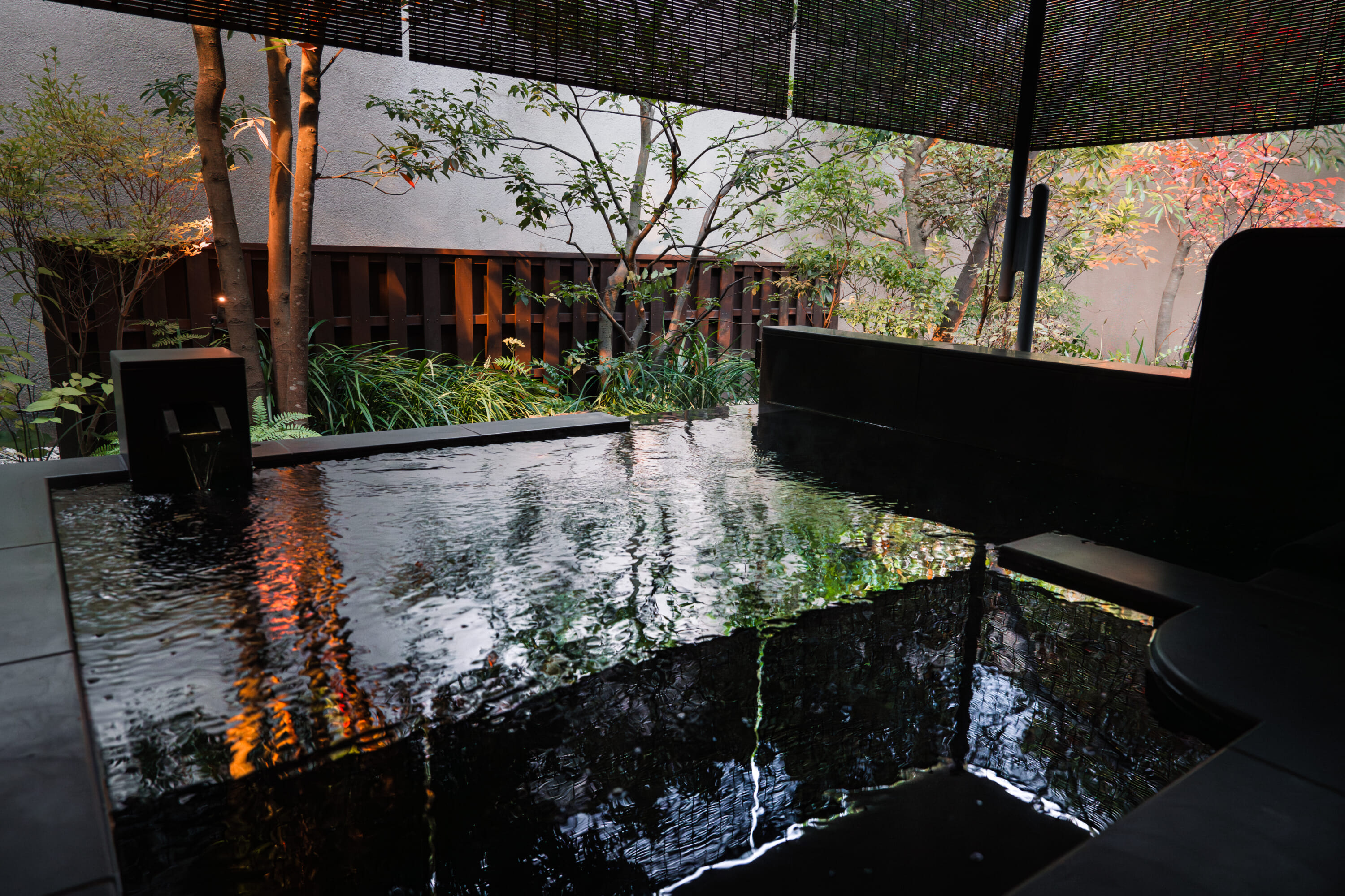 Upon arrival, guests pass through the grand entrance to a softly lit reception lounge accented with vacuum-tube amplifiers and a curated selection of vinyl. A seasonal welcome drink chosen by the in-house sommelier sets the tone, before guests are escorted to their suites — each 106 square meters and approached via a stone-lined garden path. Every room features a private open-air bath fed by mineral-rich hot spring water drawn from 1,300 meters below the property. Floor-to-ceiling garden views, retro record players and elastic horsehair pillows complete the experience.