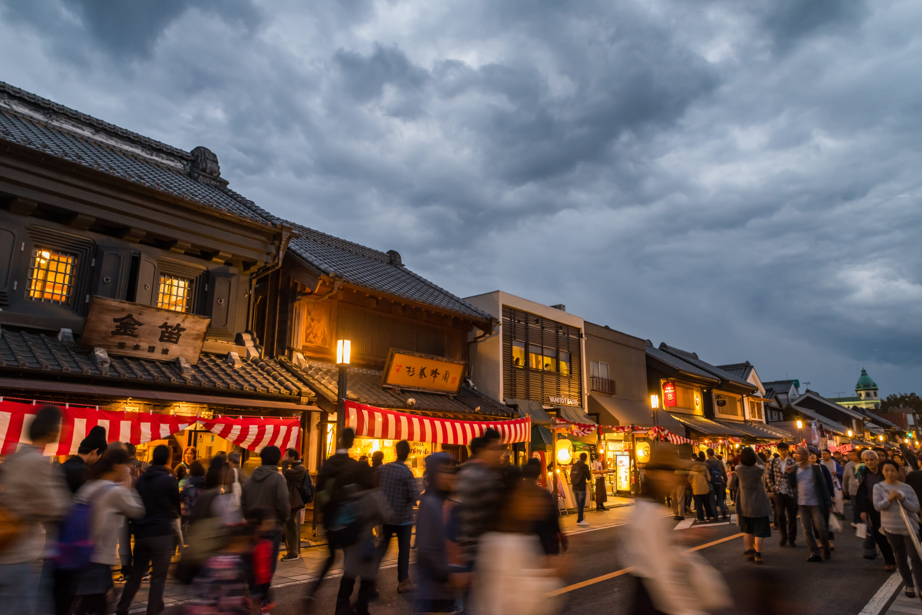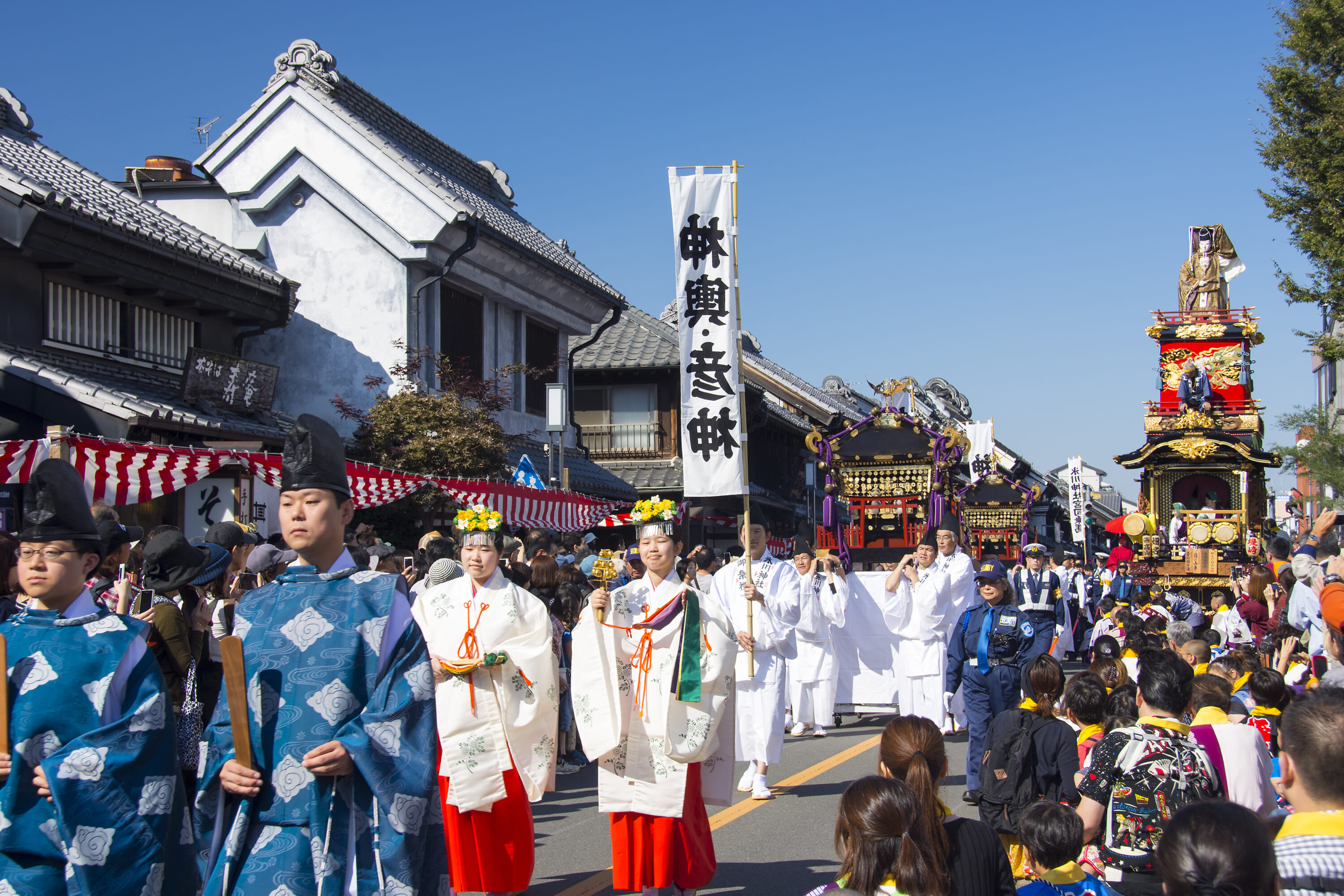 Lively musical “battles” called hiikkawase take place at night, when floats from different neighborhoods meet. The floats face each other, and the musicians and dancers on board compete in a loud and energetic performance of traditional hayashi music as the crowds cheer them on. The festival’s backdrop is the historic Kurazukuri district, with its old storehouse-style buildings, which adds to the Edo-period atmosphere.