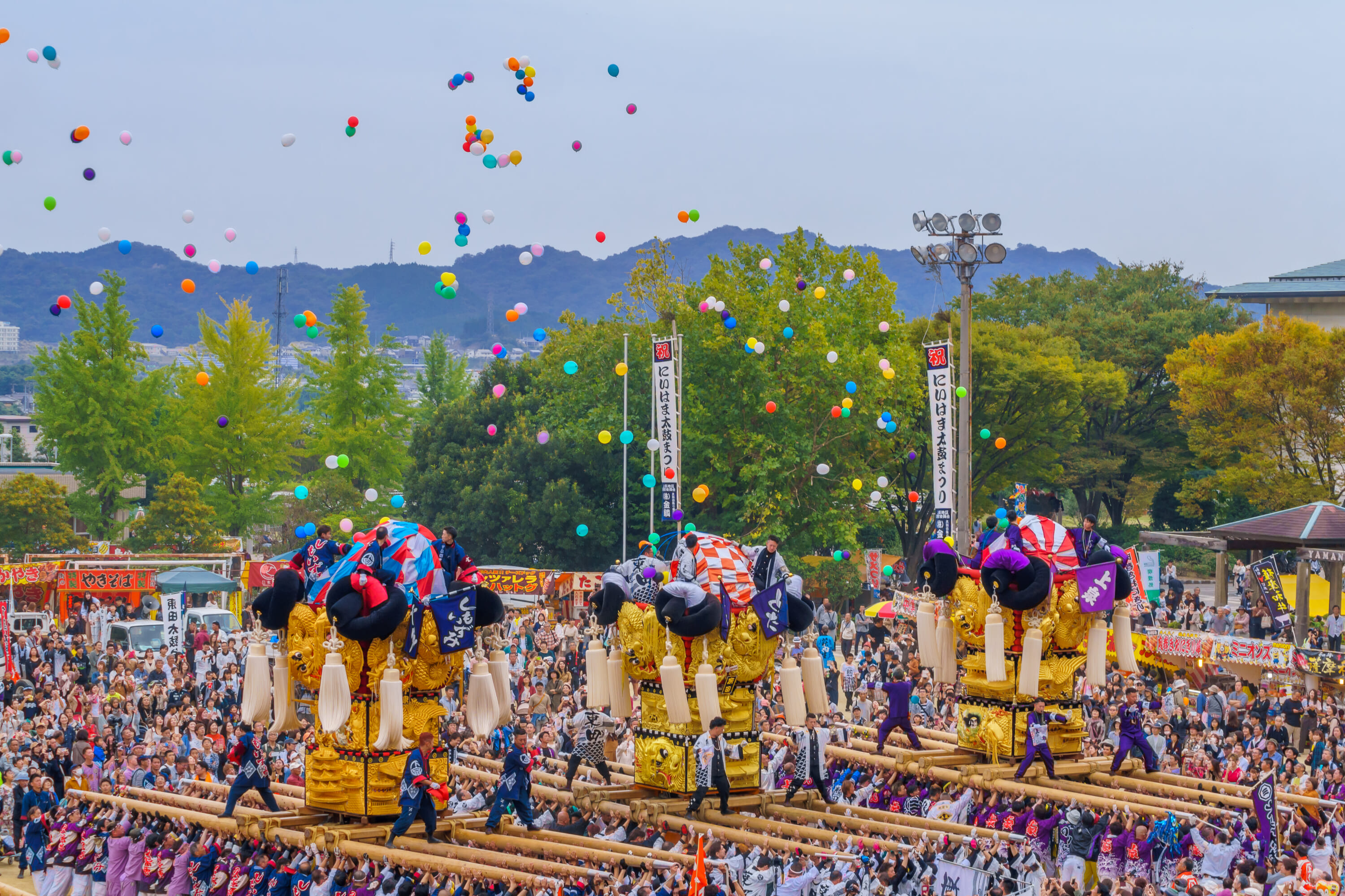 The Niihama Taiko Festival is an annual festival held in mid-October in Niihama, Ehime Prefecture. Known as one of Shikoku’s three great festivals, the 1,000-year-old event features dozens of massive, gold-embroidered floats called taiko-dai. Each taiko-dai weighs around three tons and is carried by teams of up to 150 men.