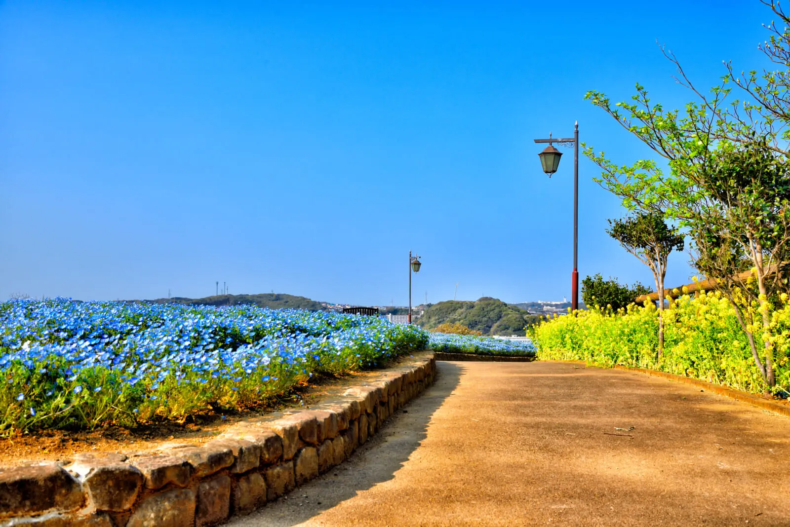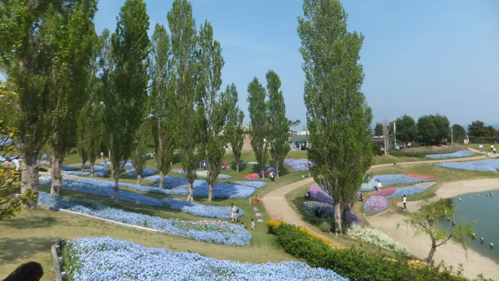 Renowned for its kochia bushes in autumn, this massive 350-hectare complex lets you combine nemophila viewing with other fun activities, including an amusement park and swimming pools. It’s also home to animals such as capybaras, kangaroos and red-faced spider monkeys. Although it has already passed, the pale blue nemophila creates a fantastic contrast with pastel pink cherry blossoms. Don’t miss the Uminonakamichi Flower Picnic event, where the 15,000-square-meter great lawn transforms into a sea of nemophila blooms, while seasonal activities and food stalls create a festive atmosphere.